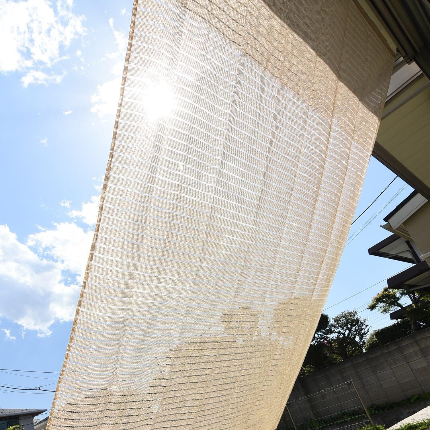 【特徴】日よけや目隠しとして使えるガーデンシェードです。外から入りこんでくる直射日光をやさしく和らげ、室内の温度上昇を緩和し、節電効果も期待できます。水洗いが可能なので汚れた場合も安心です。縦にも横にも使用できるハトメ8個タイプです。