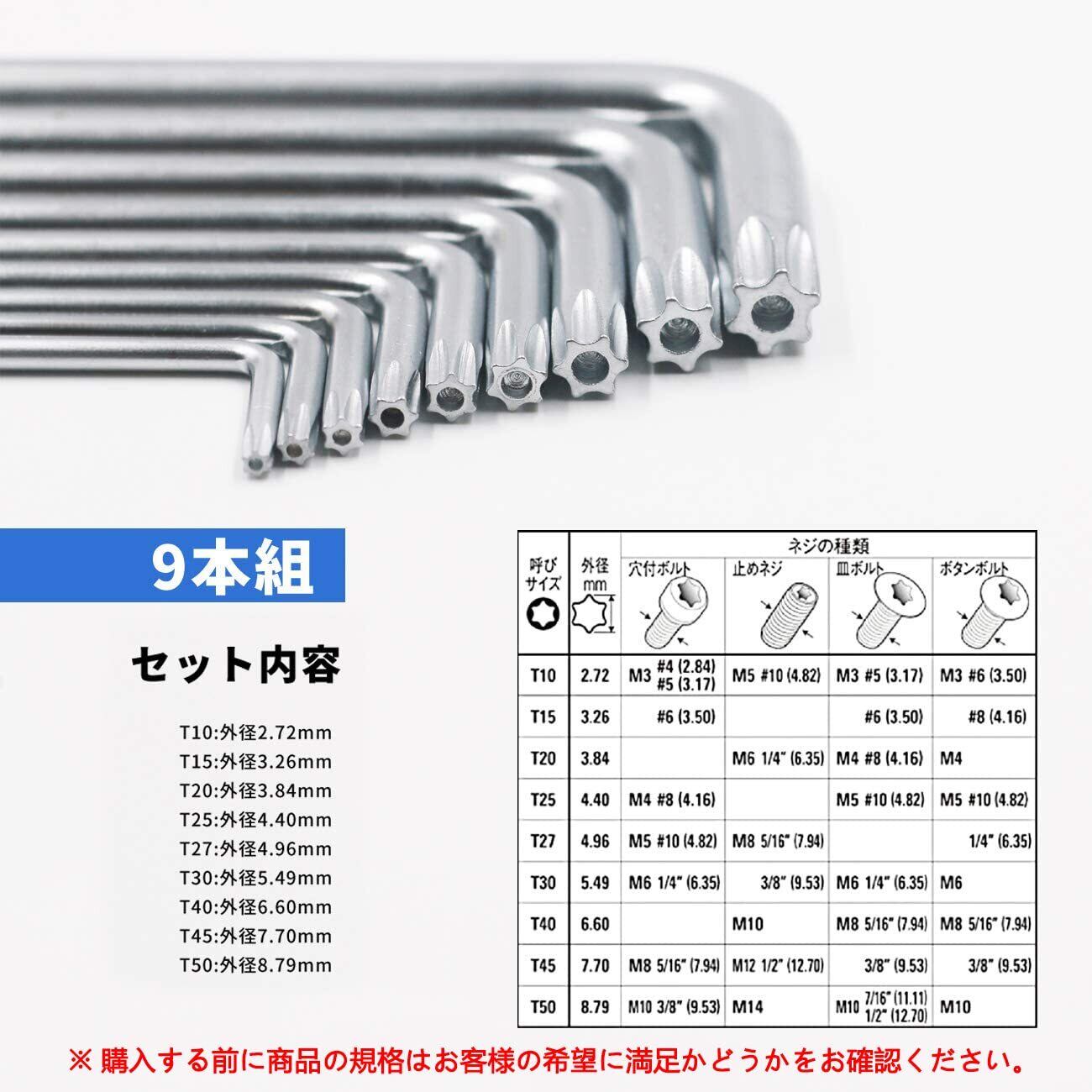【セット内容】:T10・T15・T20・T25・T27・T30・T40・T45・T50 ヘックスローブレンチセット