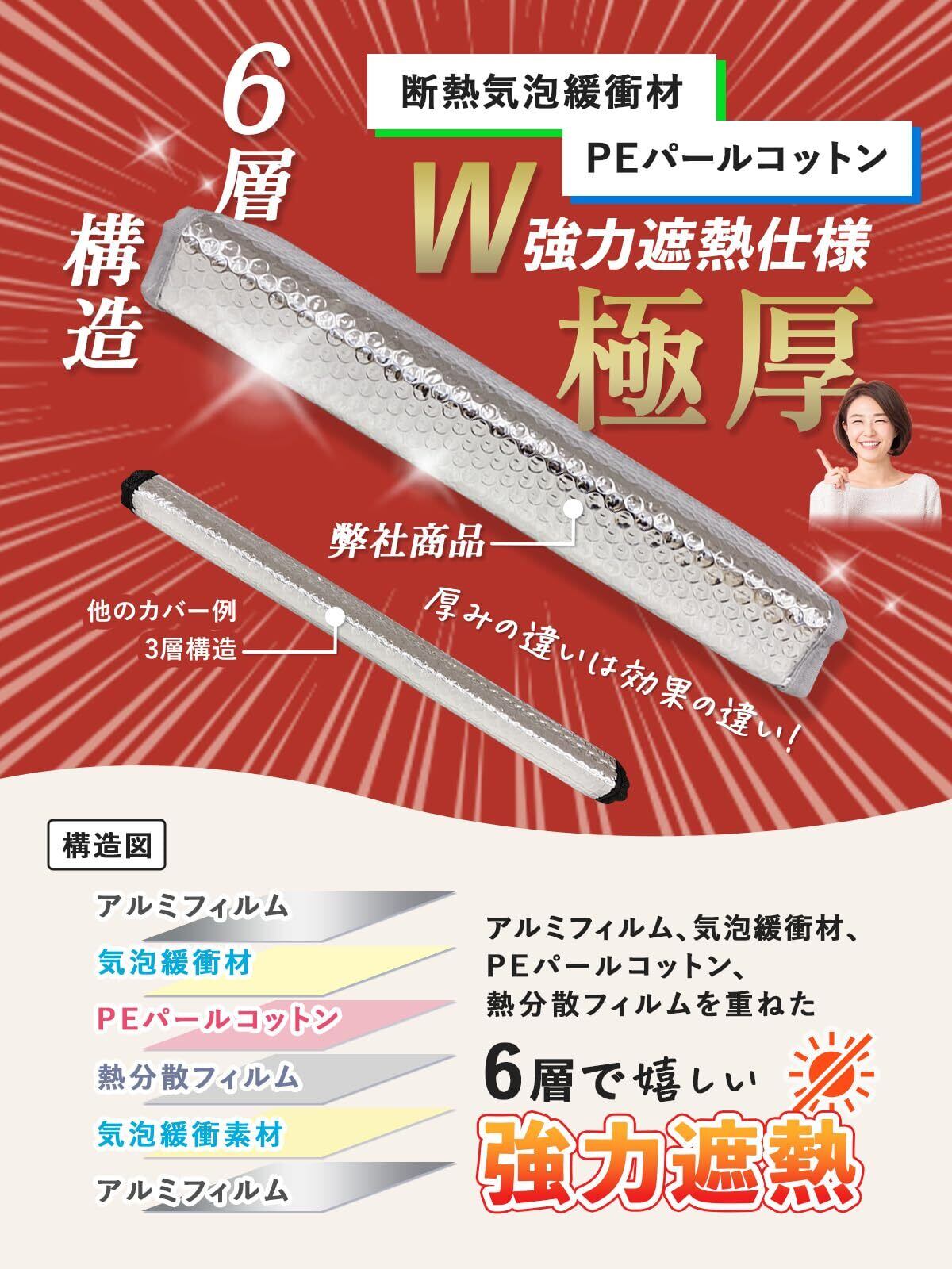 【極厚1cm・6層構造の室外機カバー】 通常の3層構造と比べ約2倍の厚み。アルミ素材に加え、真空遮熱構造の気泡緩衝材2層、内気泡型遮熱材など計6層構造で、優れた遮熱性を発揮。大切な室外機をしっかりと守ります。