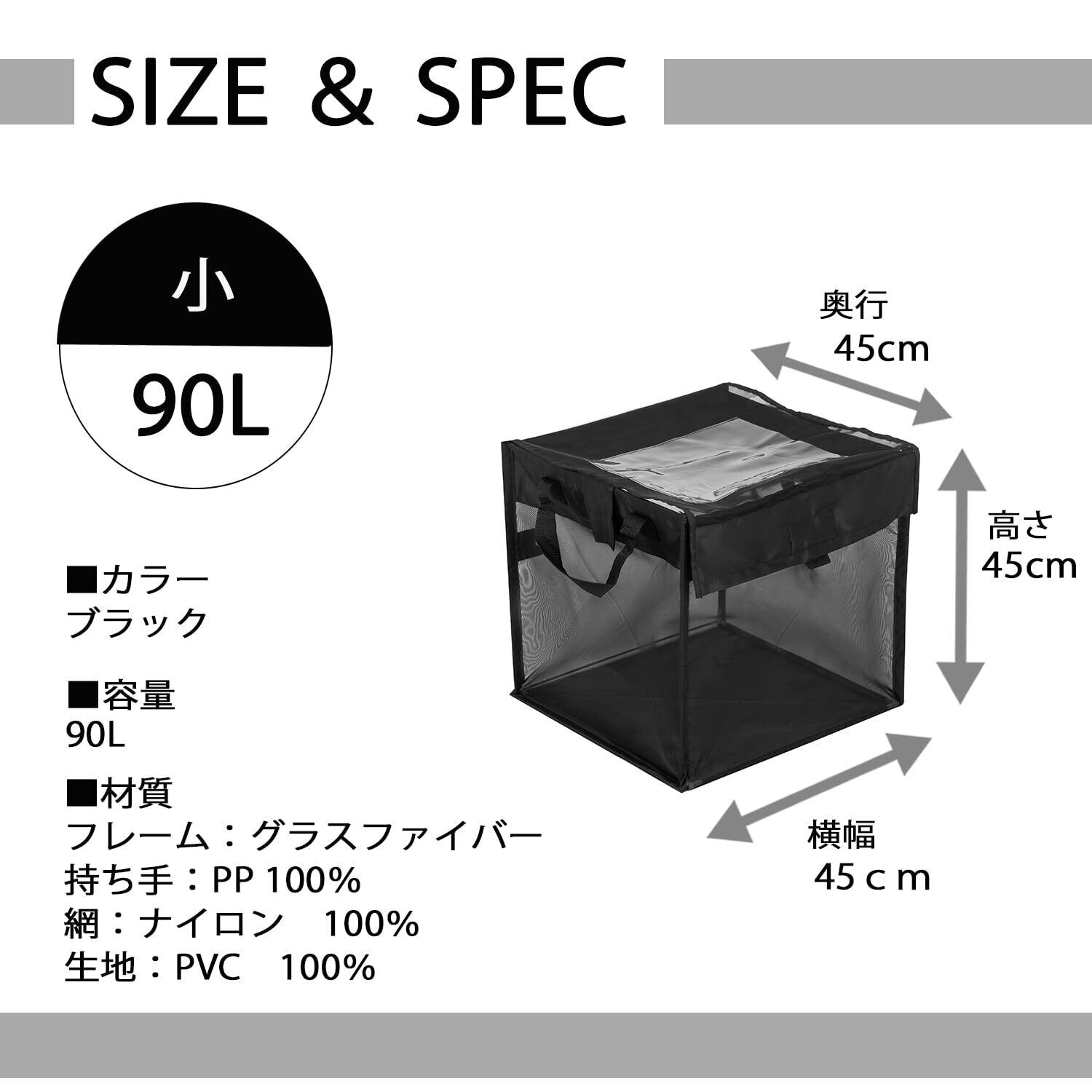 商品内容:ごみステーションボックス本体 1個 、固定用フック 1個、組み立て説明用紙 1枚、フレーム (パーツ内容は説明書をご確認ください。)。【90L】縦:45cm/横:45cm 重量:0.54kg 色 : 黒 原産国 : 中国。素材:持ち手:PP 100% シート:PVC レザー 網:ナイロン。