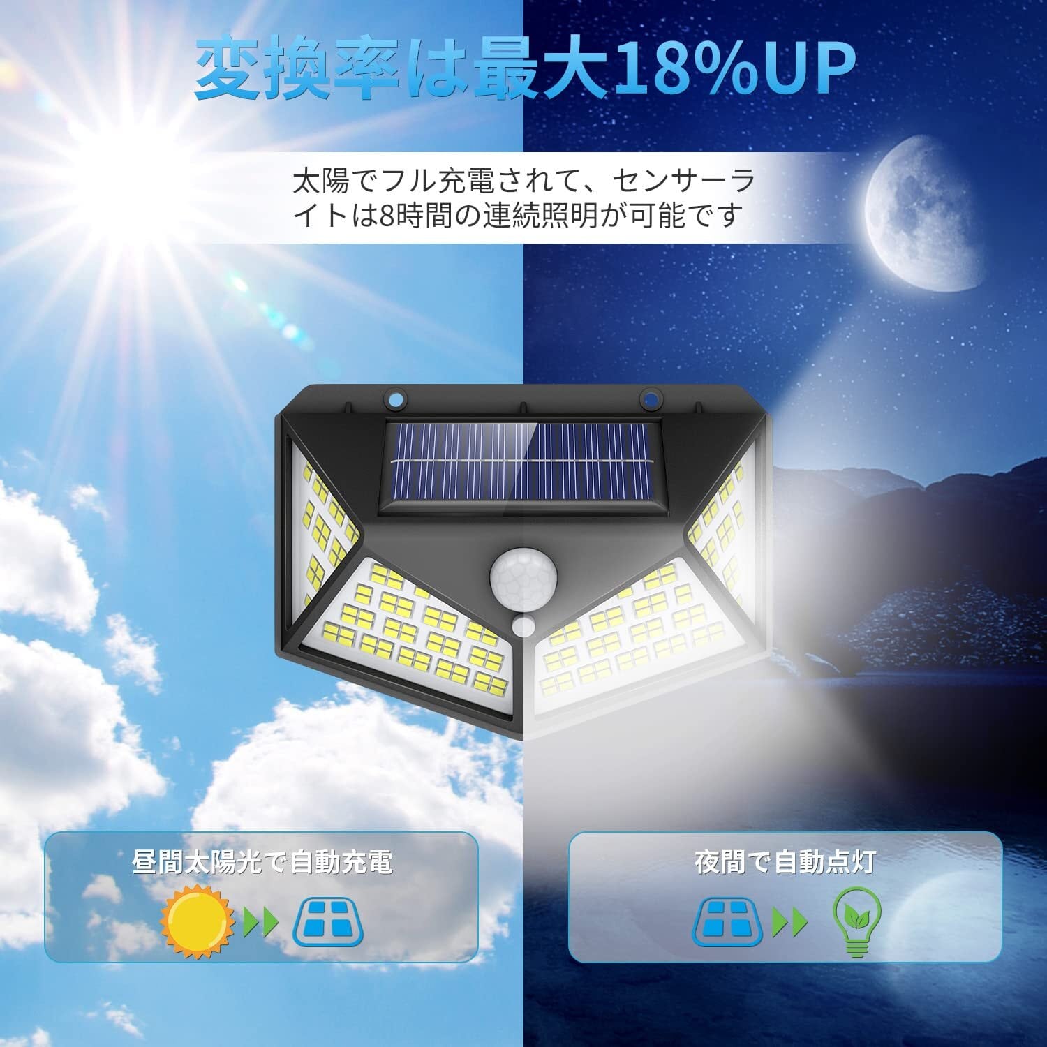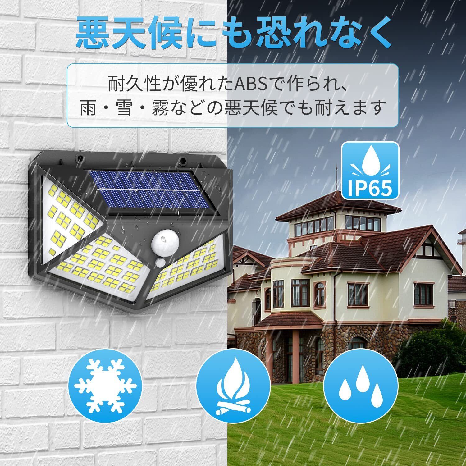 【100LED・4面発光・6個セット】のソーラーセンサーライトは発光面が4個まで増やして、照射範囲が300°以上に達し、 照明の範囲もより広いになります。玄関、庭、廊下、物置、ガレージ、ガーデン、縁側、駐車場など場合で防犯や照明に最適です。