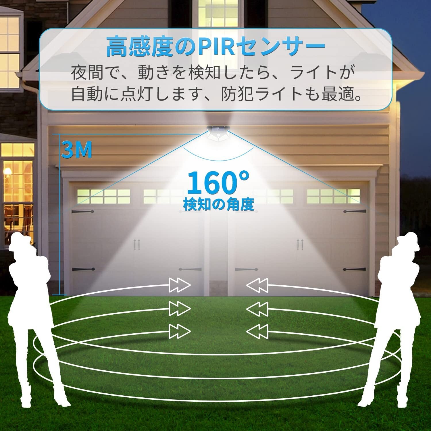 【高感度センサーと自動点灯・消灯】ソーラーセンサーライトは人感センサーと光センサーを内蔵して夜間で動きを感知でき、自動に点灯します、 人が離れると、約15-25秒の後、自動に消灯します、毎回のオン・オフ操作の手間はありません。玄関ライトや屋外防犯ライトとしては最高です。