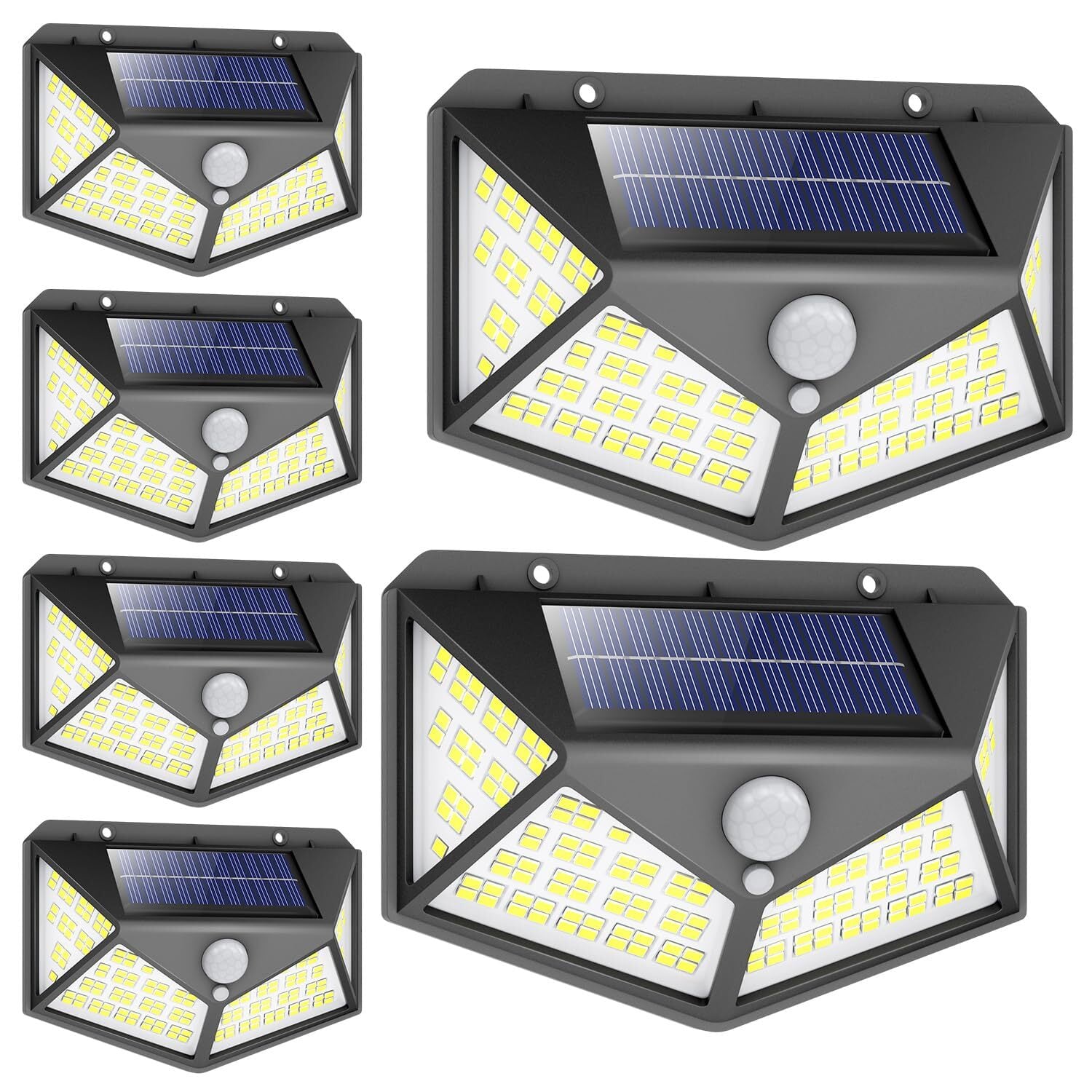 ソーラーセンサーライト【100LED 6個セット 4面発光】光&人感センサー 3つ点灯モード 太陽光発電 IP65防水 自動点灯/消灯 ガーデン/玄関/駐車場/停電時適用 防災ライト 地震 津波 台風 防災対応