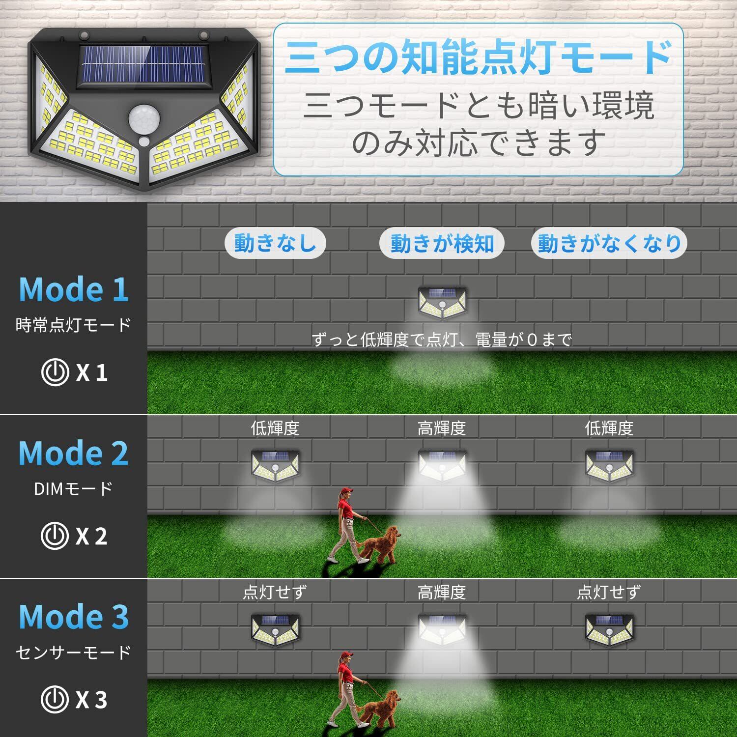 【3つ知能モード・光&人感センサーライト・自動点灯消灯】3つの点灯モードとは常時点灯モード、DIMセンサーモード、人感センサーモードで、場合によって異なるモードを設定できます。3つのモードとも昼間と明るい場所では点灯しません。【常時点灯モード】夜または暗くなると、電量が0になるまでずっと低輝度で点灯します。【DIMモード】夜や暗くなると、自動的に弱光点灯します。検知範囲以内には人や動物が来ると、自動的に高輝度点灯になって、動きがなくなると約15秒後弱い光で点灯状態に戻ります。【センサーモード】夜や暗くなると、普通は点灯しません。人や動物の動きを感知すると、自動的に自動的に高輝度点灯になって、動きがなくなると約15秒後消灯になります。