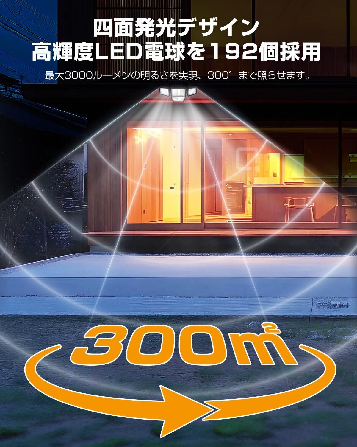 【4面照明・高輝度LED搭載・広角300°照明】Tillmulyaソーラーライト 屋外は7500K昼光色超高輝LEDランプを採用し、照明効果に優れて、光の死角はほとんどなくなります。4面照明デザインにより照射角約300°で広い範囲を照らし、超拡散な明るさを実現しました。3側のライトは上下左右に自由に回転可能で、お好きな照射方向によって自由自在に変えられます。