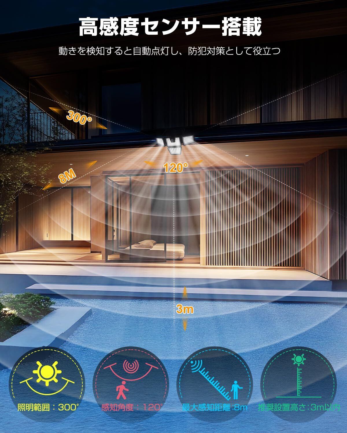 【人感センサー搭載・3段階調光機能】人感センサーと光感センサー搭載されており、120°広い感知角度で広い範囲の人を検知でき、必要な時だけ自動点灯します。センサー付きのモデルを玄関や庭の入り口に配置すれば、セキュリティ対策にもなります。暗闇を明るく照らすことで、不法侵入した不審者を照らしだしたり、暗がりなどの死角を減らせます。センサーライト 屋外は3段階調光機能(30%-60%-100%)を搭載したお好みやシーンに応じて、リラックスした雰囲気や集中できる光を演出しましょう。