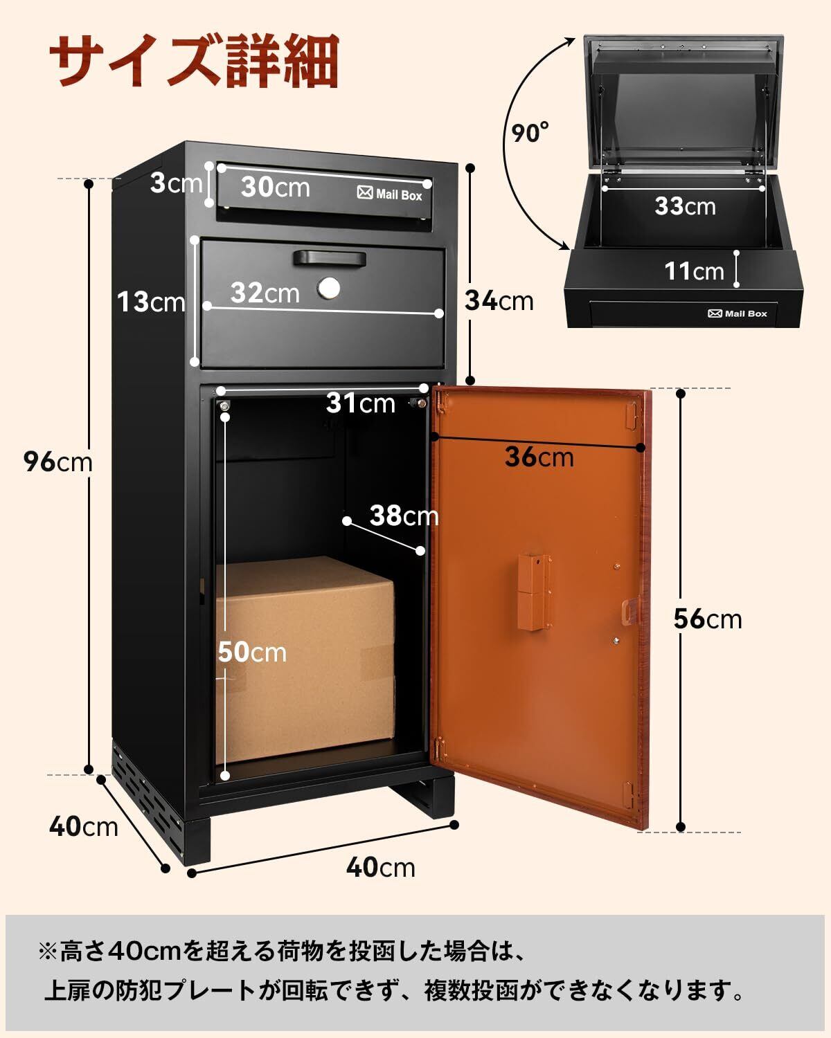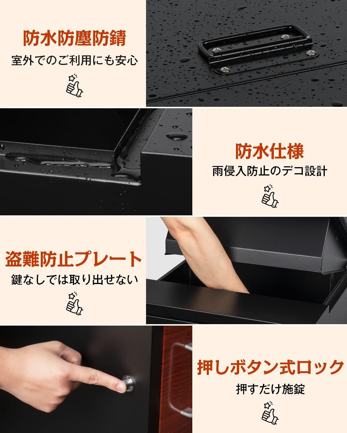 【投函、取り出し便利】メイン扉には押しボタンロックを採用し、押すだけで施錠完了。スペアキー2本付き。スペアキーを無くさないようにご注意願います。内部の緩衝パッドが衝撃を吸収し、荷物の破損を防止します。 【両開き扉】扉の向きが変えられますので、置く場所を選びません。内部に印鑑入れがあります。