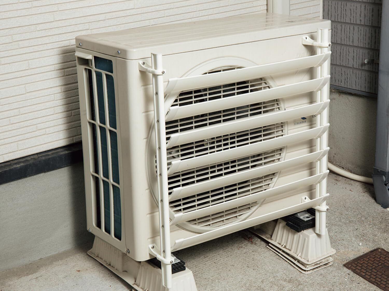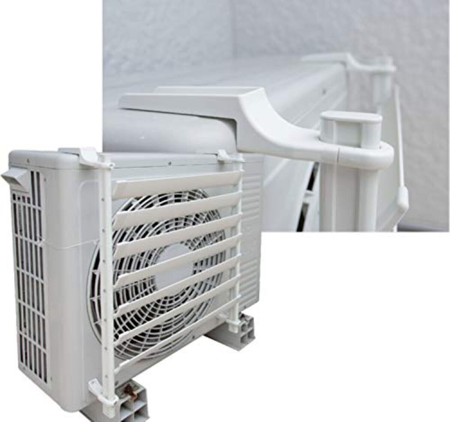 エアコン(家庭用サイズ)室外機の風向きを変えることが可能。<br>狭いベランダ、塀が近い所での暖気のよどみの解消や隣家や植栽への直風への配慮などに最適。<br>両面テープで取り付け可能な室外機専用取付台座(ASA製)と落下防止の紐も付属しております。