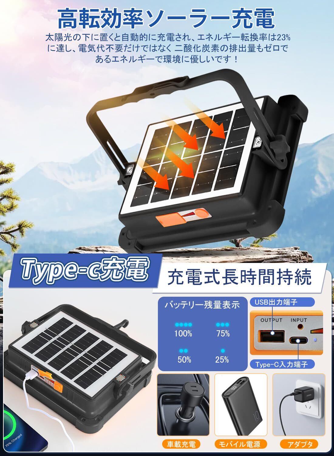 【2つの充電モード・バッテリー残量表示】この作業灯は12000大容量バッテリーを提供し、最長10時間連続使用し、日常的なニーズに対応しています。そして、2つの便利な充電モードがあります。① ソーラー充電:このledライトはソーラーパネルを搭載し、能力転換率は20%に達し、電気を使用する必要はなく、二酸化炭素0を排出し、非常に環境に優しい。②USB充電:パソコン、携帯電話の電池、シガレット点火器のコンセントなどを使って充電することができます。底部には電量表示があり、充電は非常に便利で、屋内での使用だけでなく、キャンプや夜釣りなどのアウトドアでも使用できます。
