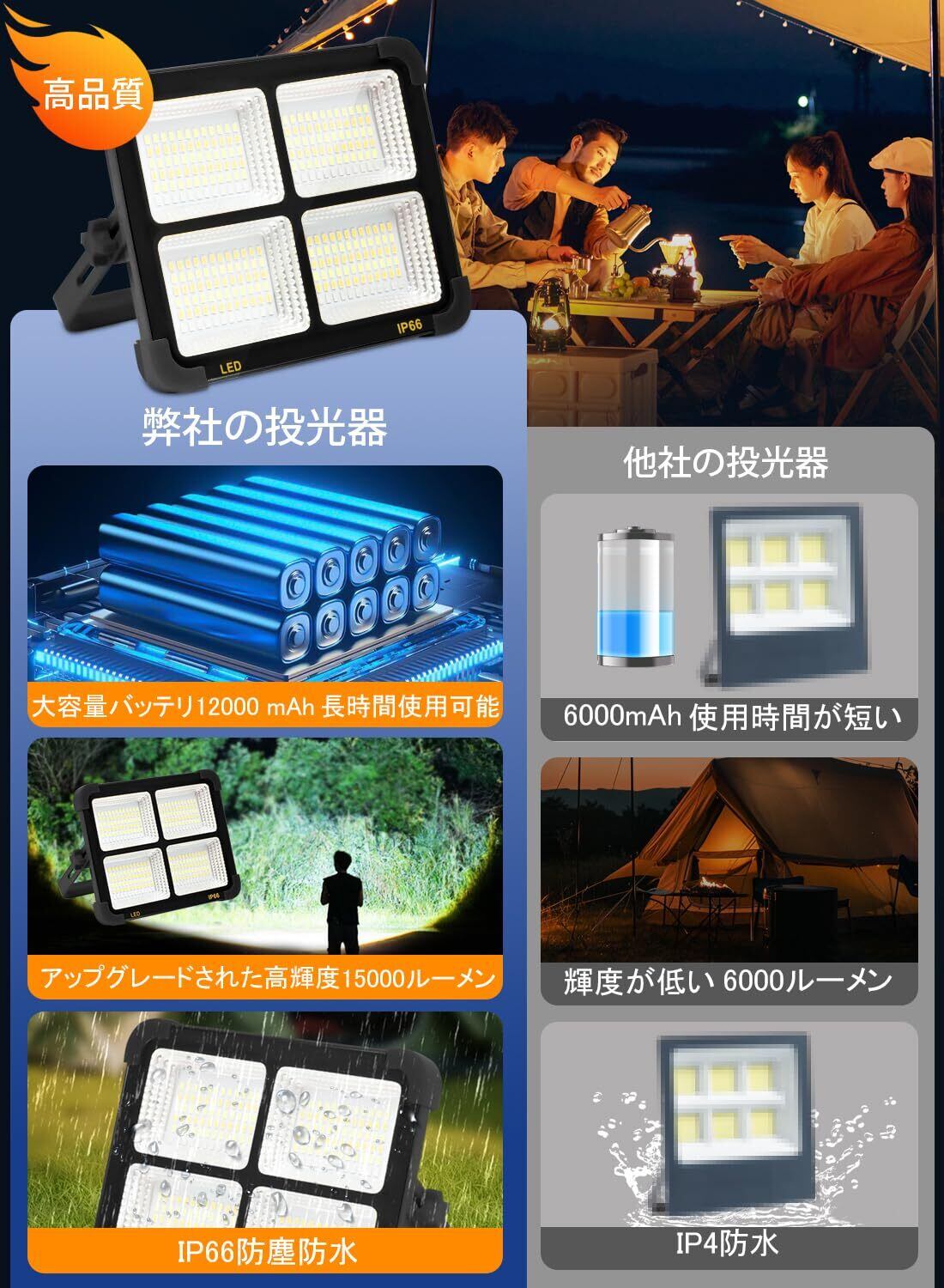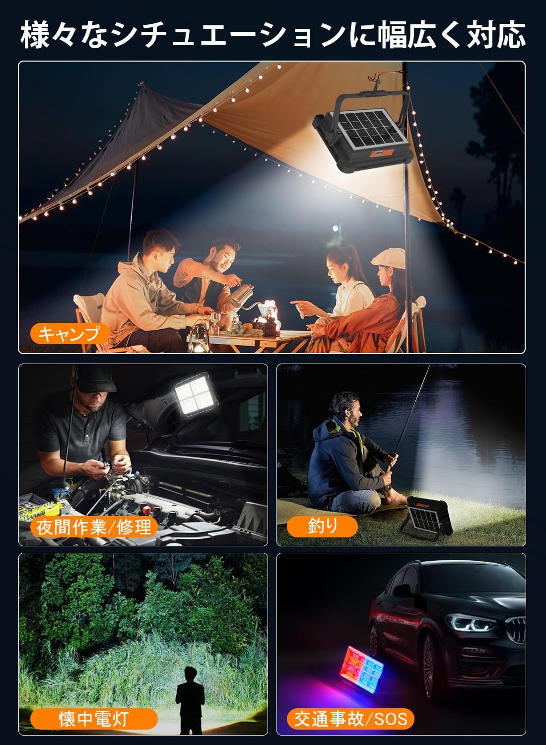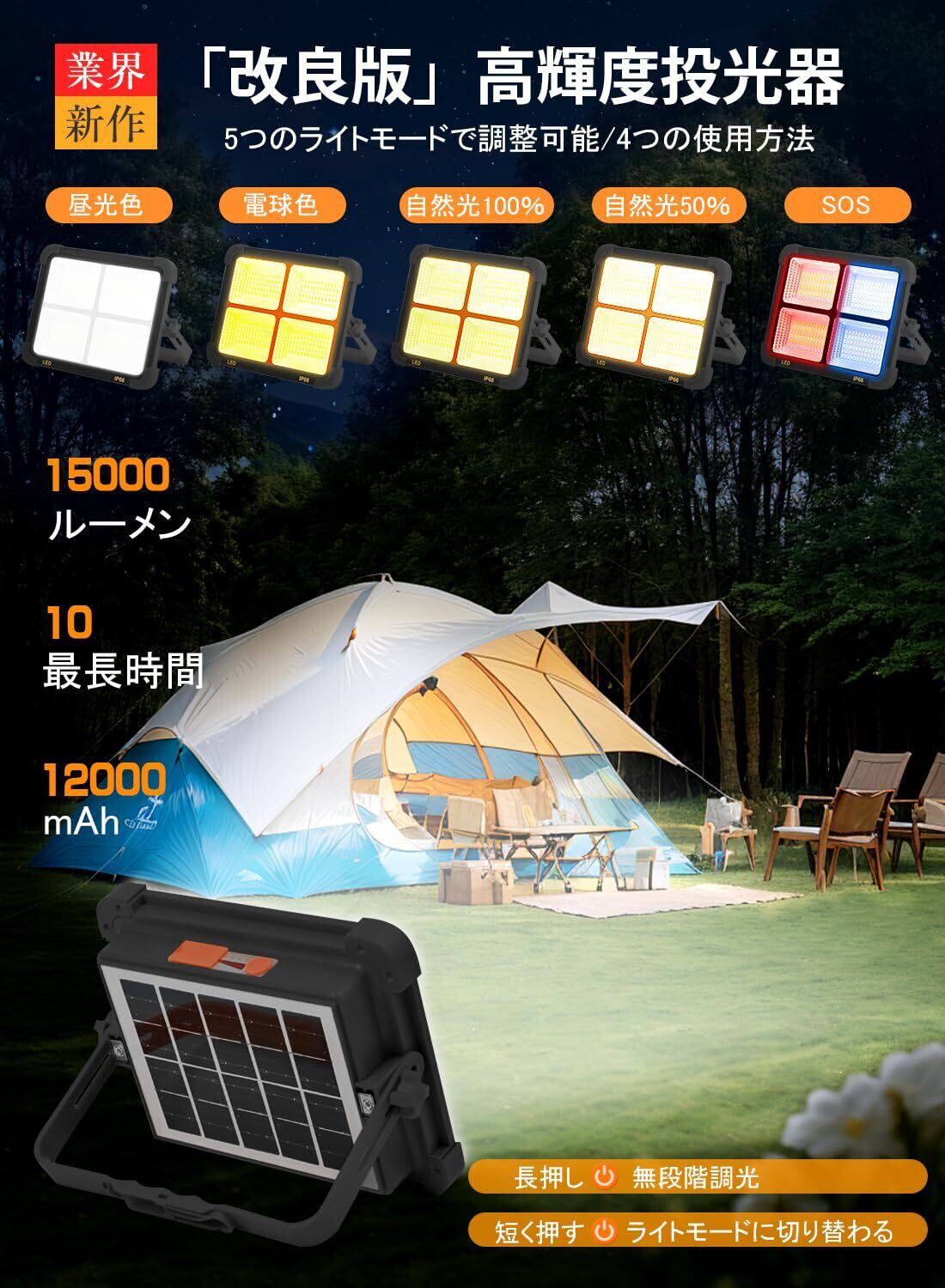 【業界新改良!高輝度5モード・無段階調光】はアップグレードされたSMDチップを搭載した高品質なled投光器を新改良し、超高輝度を実現しました!市販の投光器よりも明るく耐久性があり、幅広い照明を提供します。短押しで調節可能な照明モード:①昼白色、②電球色、③100%自然色、④50%自然色、⑤赤青点滅(SOS)モード。使用シーンに応じて照明モードを自由に調整できます。ボタンを長押しすることで明るさを自由に調整できます。
