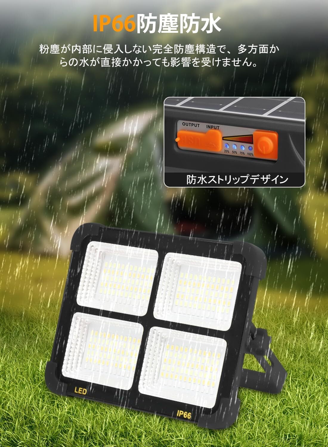 【高品質素材・IP66防水防塵】投光器は高品質素材を採用し、従来品より耐熱強化ガラスを使用し、いかなる極端な条件下でも明るい光を照射することができます。 また、丈夫なPVCプラスチック素材と頑丈なソーラーパネルを組み合わせ、耐久性と安定性を高めています。 本製品はIP66認証を取得しており、突然の雨や雪でもスムーズに作動します。LED作業灯は防塵防水仕様を採用し、屋内でも屋外でも突然の悪天候にも対応できます。 ご注意:本製品は水に浸さないでください。