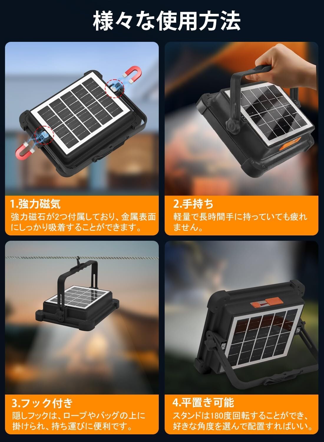 【調節可能な多機能スタンド・4つの使用方法】屋外led投光器は背面に調整可能なブラケットが付いており、ボタンを回転させた後、自由に180度調整することができます。①強力磁気:強力磁石が2つ付属しており、金属表面にしっかり吸着することができます。②手持ち:軽量で長時間手に持っていても疲れません。③フック付き:隠しフックは、ロープやバッグの上に掛けられ、持ち運びに便利です。④平置き可能:スタンドは180度回転することができ、好きな角度を選んで配置すればいい。