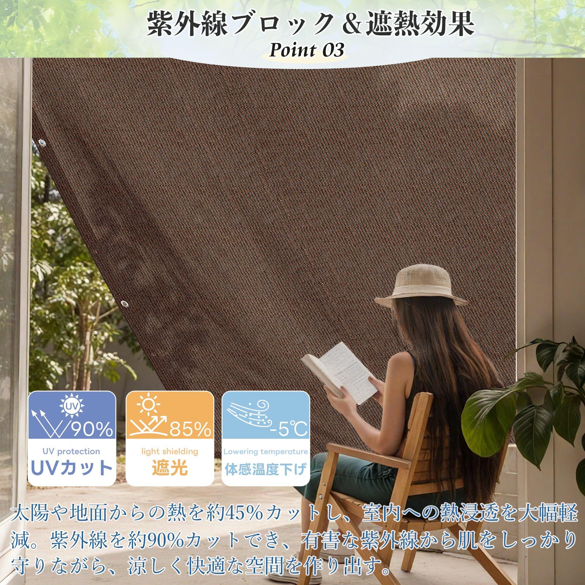 【UV剤配合で耐用年数3年】ベランダ サンシェードにUV剤を配合することで、紫外線による素材の劣化を大幅に抑制し、通常の使用環境下で3年間安定した遮熱性能と機能を維持できます。UV剤が紫外線を効果的に吸収し、日光や雨に長時間さらされてもベランダ 日除けの素材が褪色したり硬化したりするのを防ぎ、長期間にわたってベランダ シェードの機能を発揮します。頻繁な買い替えが不要となり、経済的かつ環境にも優しい選択肢となります。
