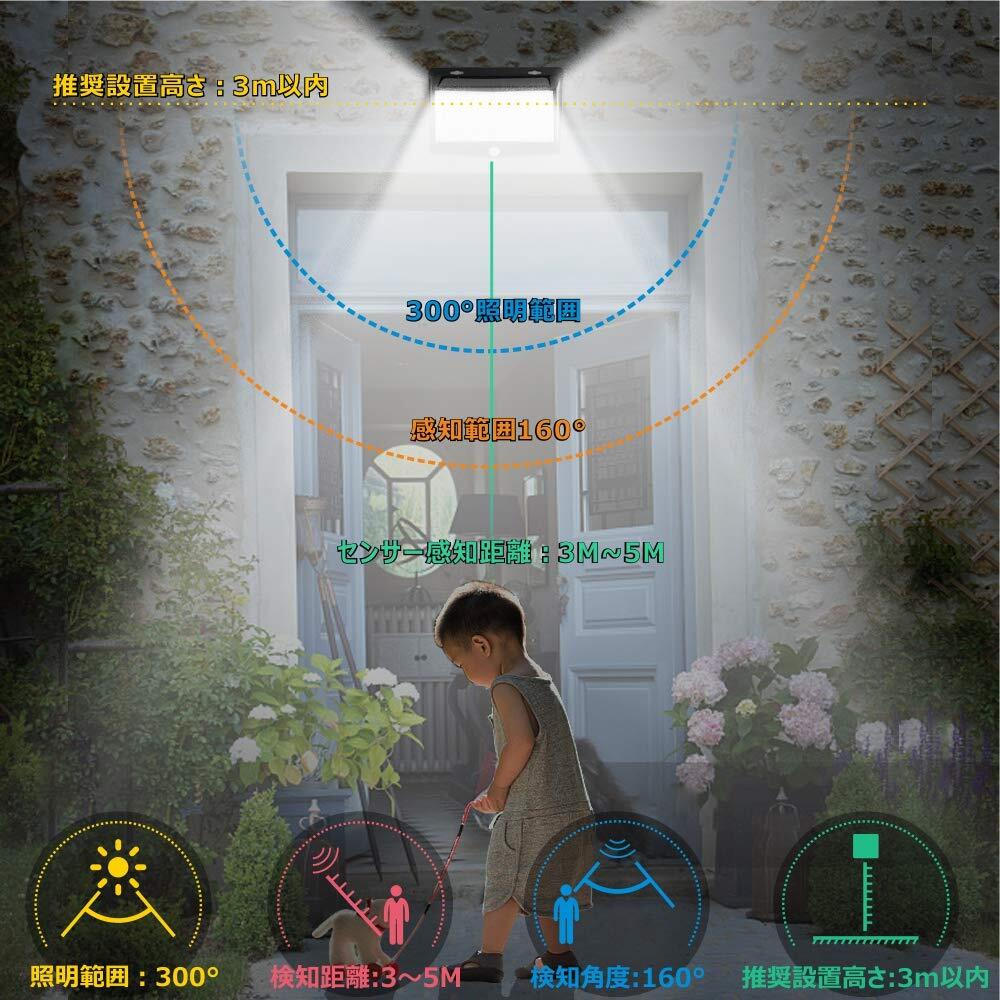 【人間な3つの知能モード】このセンサーライトは常時点灯モード、DIMモード、センサモード3つの知能モードが搭載されます。お使用の場合によって、モードを選択できます。【常時点灯モード】昼間と明るい場所では消灯します。夜や暗くなると、自動的に弱い光で点灯しています。【DIMモード】夜や暗くなると、自動的に弱光点灯します。人や動物の動きを感知すると、自動的に高輝度点灯になって、動きがなくなると約15秒後弱い光で点灯状態に戻ります。【センサーモード】夜や暗くなるんと、人や動物の動きを感知すると、自動的に自動的に高輝度点灯になって、動きがなくなると約15秒後消灯になります。 玄関先に設置しておけば、帰宅時や来客時にも、暗い足元や手元を照らしてくれるので、夜間でも安心です。