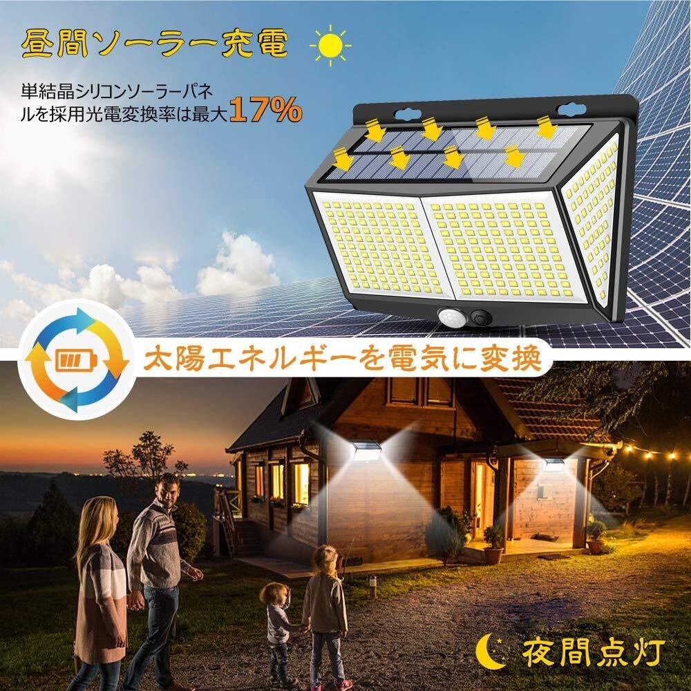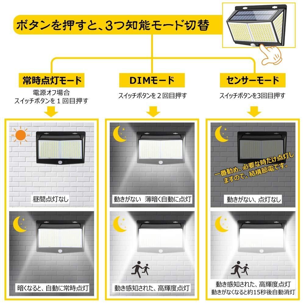 【最新版288LED・4面発光・2600mAh大容量電池】は数年センサーライト研究開発と技術革新に専念しており、今まで数万個を販売しました、お客様から様々な意見を聞いて、288LEDソーラーライト3つの知能モードを出品します。高輝度288個LEDチップが搭載、四面に同時照明可能、発光効率の高い上に、ワイドな幅が照射角度を保っており、照明範囲が普通の120°から300°に変更して、夜間照明の範囲を大幅に広くなり、防犯ライトとして、防犯効果も抜群です!また、内蔵2600mAh大容量充電池は大容量で、フル充電されたらより長い時間で使用できます。