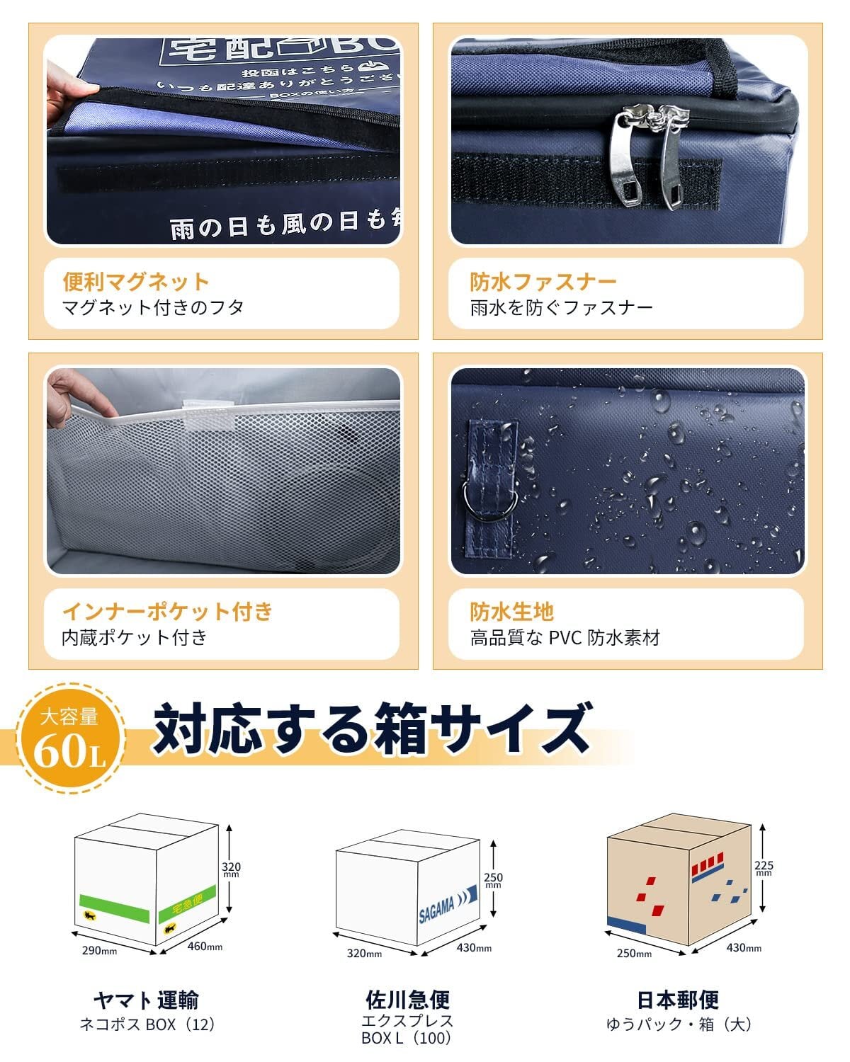 【 高品質の防水素材】 折りたたみ式置き配ボックスは PVC とポリエステルの 2 重 構造で作られ、 防水性に優れています。 そして、 ナイロン防水ジッパーは一般のジ ッパーより防水効果があります。 雨がかかる玄関でも安心して設置できます。 ※ 本 製品は簡易的な宅配ボックスです。 防犯性の高いものではありませんのであらかじ めご了承ください。