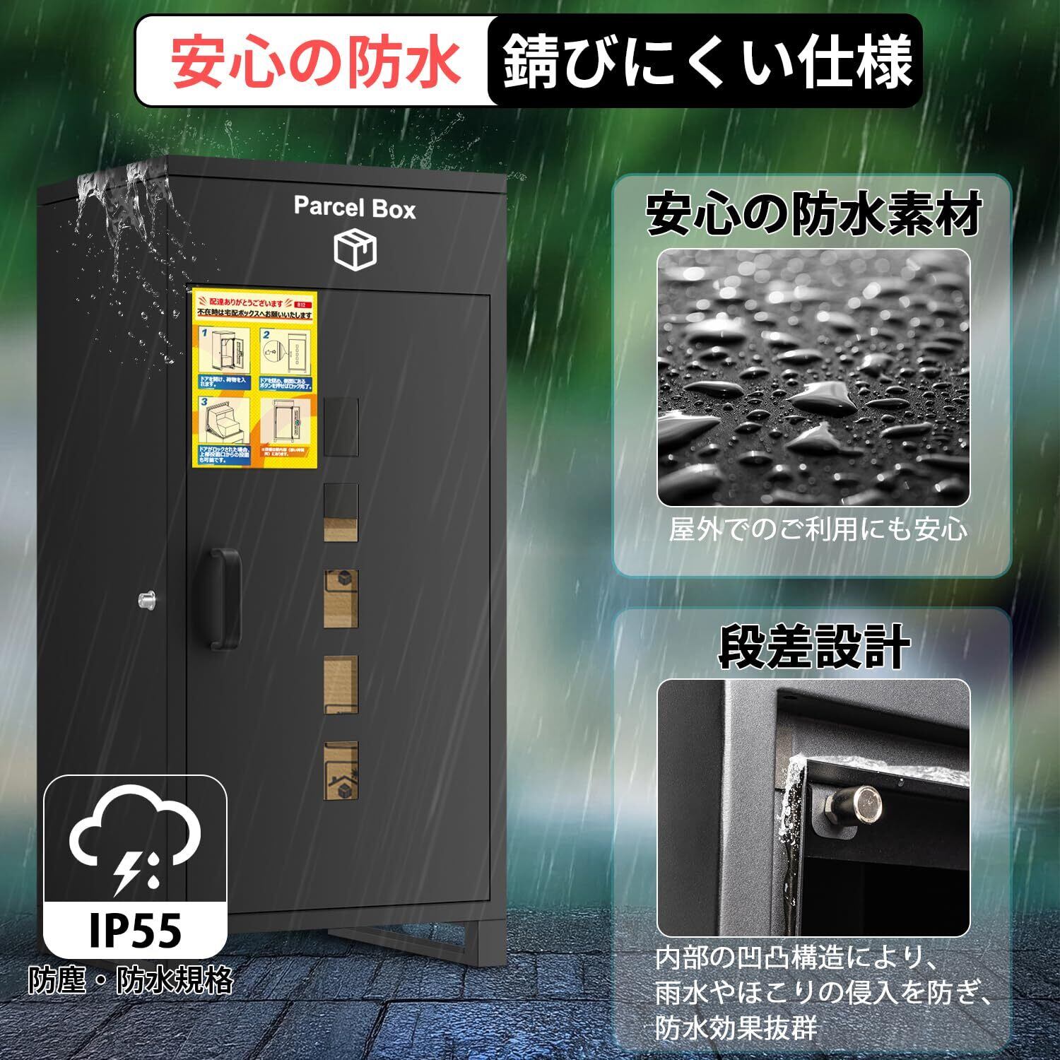 【防水防塵・細部まで丁寧な仕上げ】IP55の防塵防水構造を採用することで、雨水やホコリの侵入を防ぎます。それに宅配ボックス全体に亜鉛メッキを施し、防錆性に優れており、屋外でもより長くご利用頂けます。メイン扉にマグネット付き、磁力でしっかり閉まります。また、付属したクッションパッドを内部の底部に設置し、荷物の落下による衝撃を軽減して荷物の破損を防げます。【両開きドア】設置場所を選ばない両開き扉を設計され、様々な設置場所に合わせて向き変更可能です。内部に印鑑入れが設置されています。