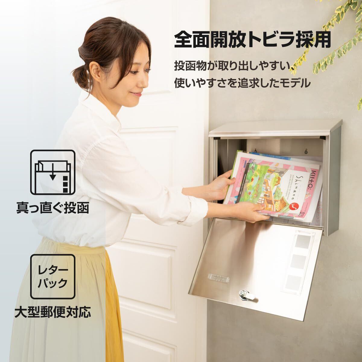 【サイズ・重量・素材】メールボックス ■構造部材:ステンレス SUS304 ■サイズ:幅40.5cm×高さ34㎝×奥行13cm ■重量:2.5kg ■対応サイズ:レターパック・角2・A4・B5・封書・はがき・書籍・カタログ・角型3号・通販メール便等 ■付属品:・取付用 施工マップ・取扱説明書・鍵(2個)・取り付け金具(アンカー×4 スペーサー×4 ネジ×4) ■下穴サイズ:直径6mm×30mm※ドリルなどを使用して開けてください【ご注意ください】当店のポストは水に強い設計となっておりますが、完全防水ではございませんので軒下への設置を推奨いたします。早めにお届け物を取出すようお気を付けください。