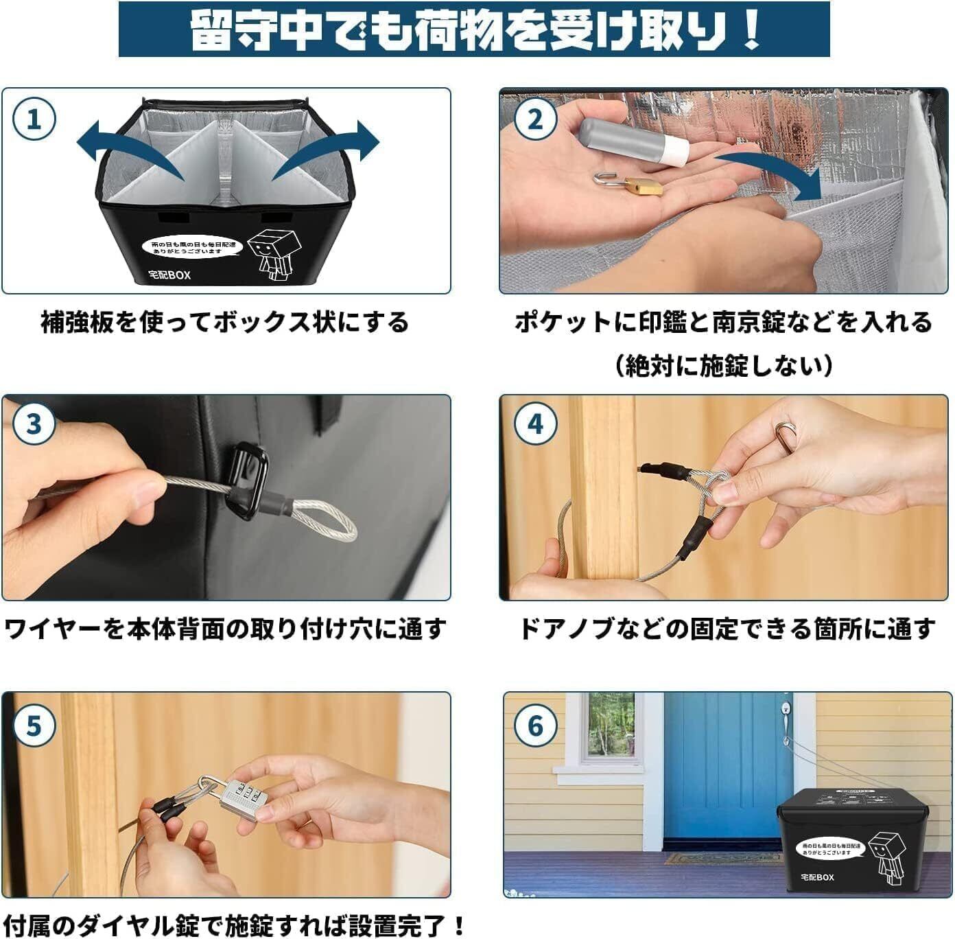 【完備な付属品セット】【本体サイズ】約幅51×奥行43×高さ33cm。【折り畳み時】約幅52×奥行35×高さ7cm。【セット内容】宅配ボックス×1、南京錠×1セット、ダイヤル錠×1、盗難防止ワイヤー×1、Sフック×2、案内ステッカー×1、取扱説明書×1、お届けした際に何か問題や初期不良などがございましたら、注文履歴にアクセスし、(出品者に連絡する)から、ご連絡くださいますようお願い申し上げます。