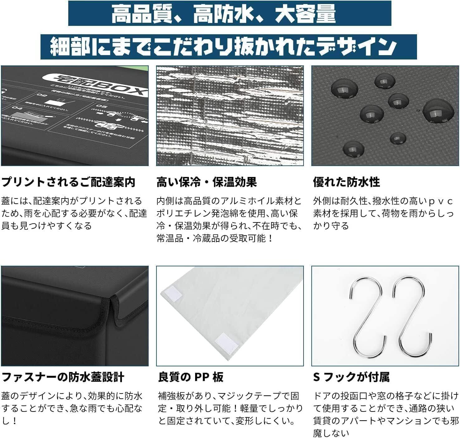 【防水・保温・保冷・扱いやすい】従来品と比べて、高耐久性、撥水性の高いPVC素材を採用して、紫外線や雨風を遮断し、ファスナーの隙間から水が入る可能性があるので、蓋のデザインはファスナーをしっかりと保護してくれ、雨の日でも宅急便を濡らさずに受け取れます。また、裏面に高品質のアルミホイルとポリエチレン発泡綿を採用しており、高い保温・保冷効果が得られます。蓋には配達案内がプリントされているため、配達員が見つけやすくなっています。