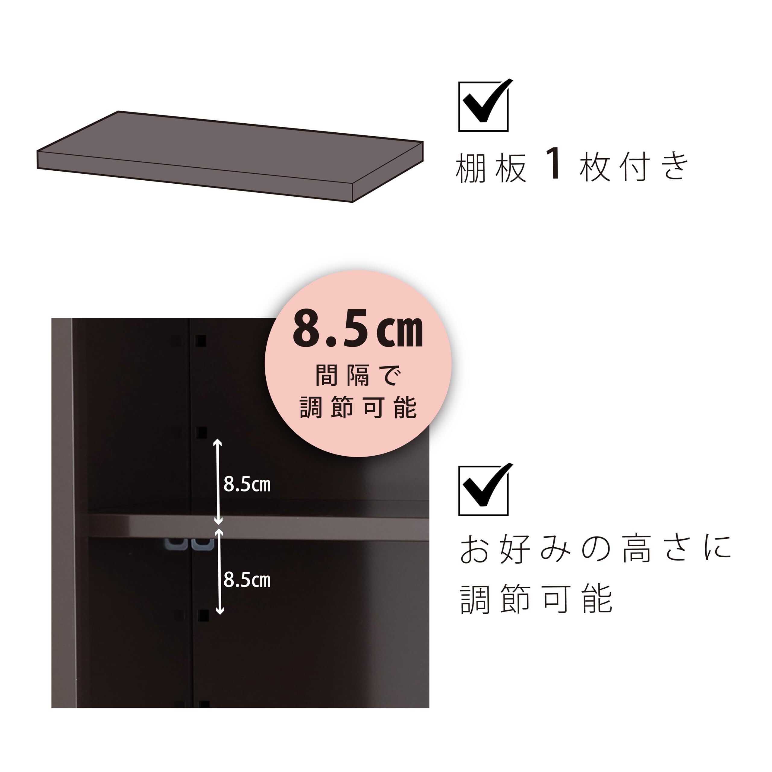 【収納物に合わせ高さを変えられる棚板付き】本体には、自由な高さ(8.5㎝間隔で6段階調節可能)に設置できる棚板が1枚付属しております。追加購入も可能で、収納物に合わせて庫内をカスタマイズいただけます。
