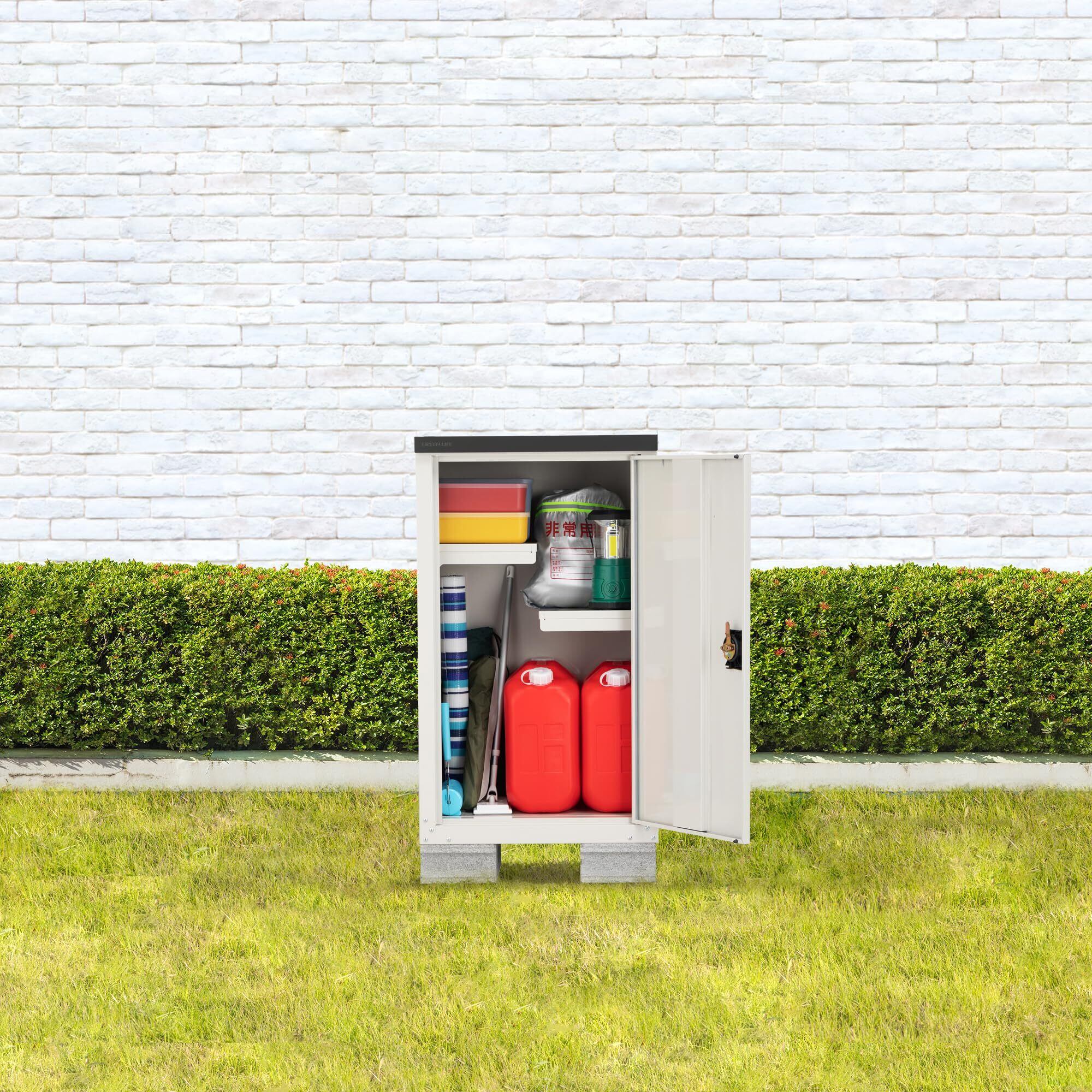 盗難防止用の鍵付。軒下・ベランダなど少しのスペースを有効に活用できる小型収納庫。