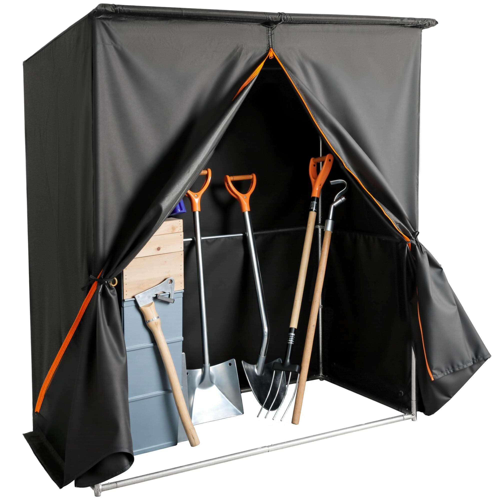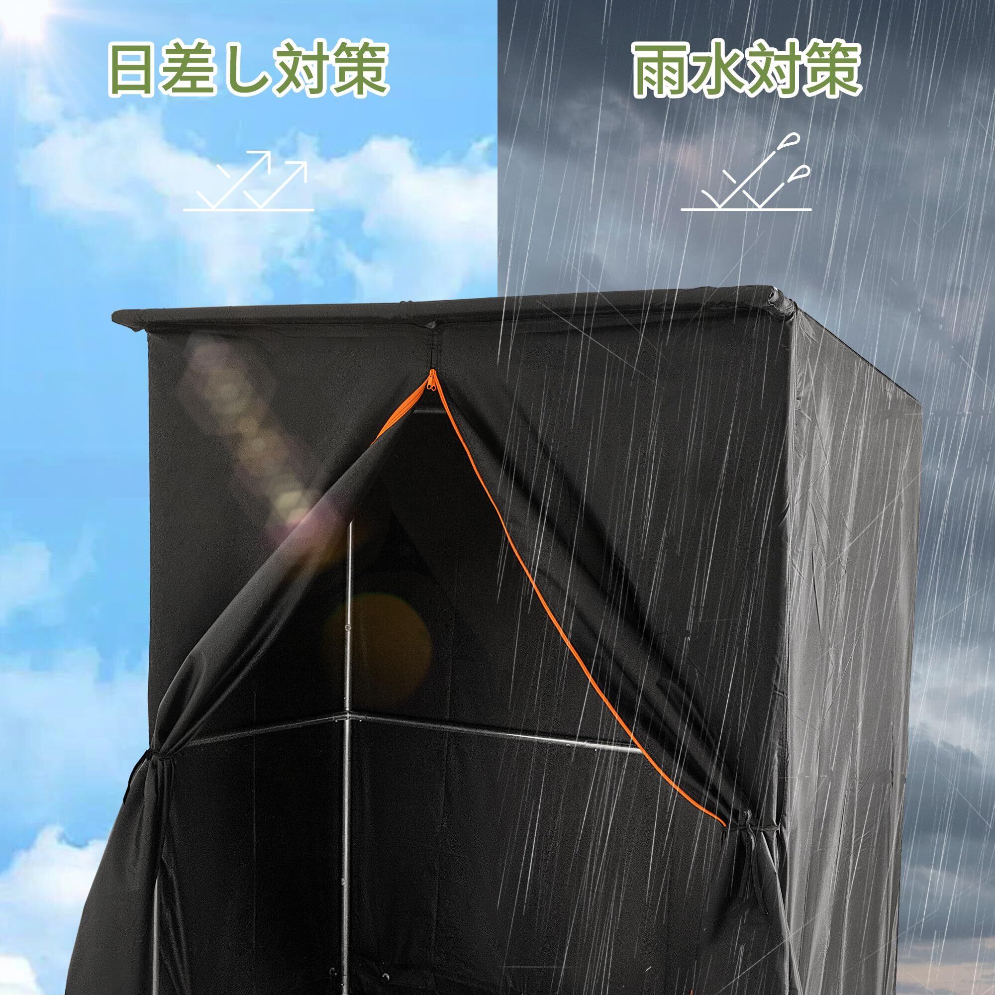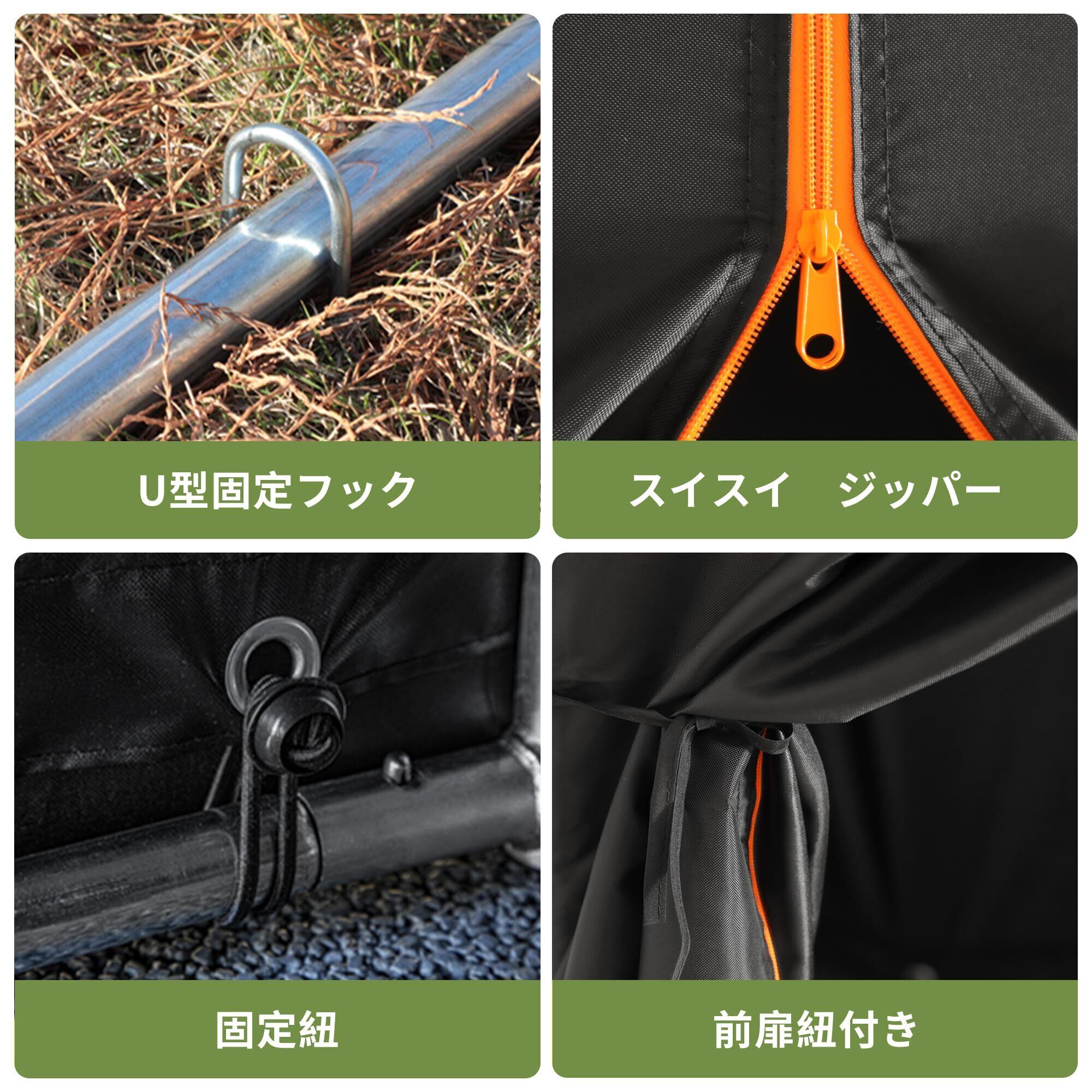 【日差しや風雨から物を守る】テント全体は高密度オックスフォード生地を採用!紫外線や熱を遮断し、大切なご私物の劣化や色あせを防ぎます。テント表面は撥水加工を施しており、1000mm以上の耐水圧で雨水侵入を完全に防ぎます。撥水設計、斜の天井は雨水を順調に流せる、テントの縁も裾のデザインを採用して防水性が更にアップする!前扉のジッパーを閉めて大切な収納物をしっかり守ります。