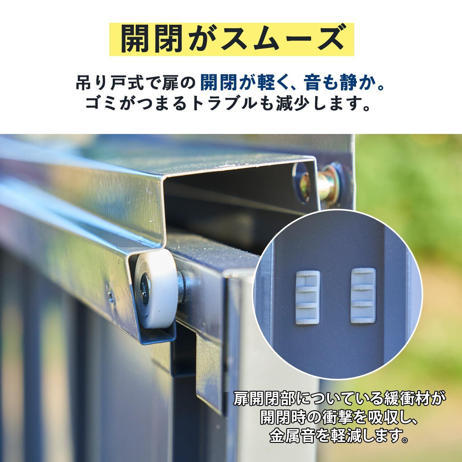 【扉の開閉がスムーズ】扉のレールは吊り戸式を採用しています。扉の開閉が軽く、音も静かでスムーズです。ゴミがつまるトラブルも軽減できます。扉開閉部に緩衝材が付いており、扉を閉めるときに起こる金属音の軽減、衝撃吸収の役割を果たします。下部レールは棚板一体型設計になっており、浮きや剥がれに強いです。また、「砂落とし水抜き穴」がレールに施され、ゴミつまりを軽減します。