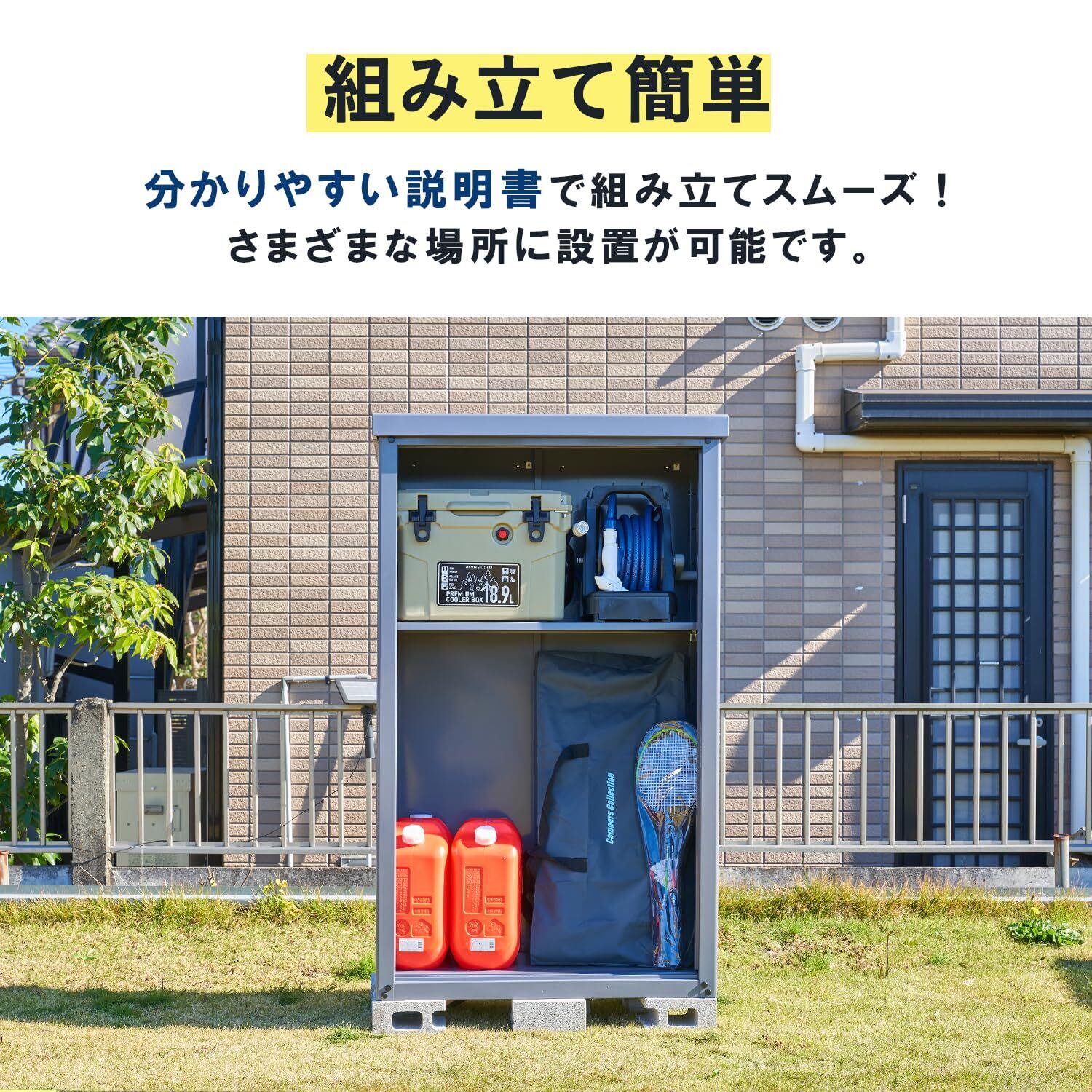 【仕様】可動棚板1枚付きで、10㎝間隔で調整が可能です。安心の専用鍵付き。棚板受け金具は引っかけ仕様で、荷物の出し入れの振動で棚板が外れるリスクが少ない設計です。天板の隙間を減らす設計で湿気の侵入を抑制します。上部金具と底板アンカーの利用で転倒防止に役立ちます。