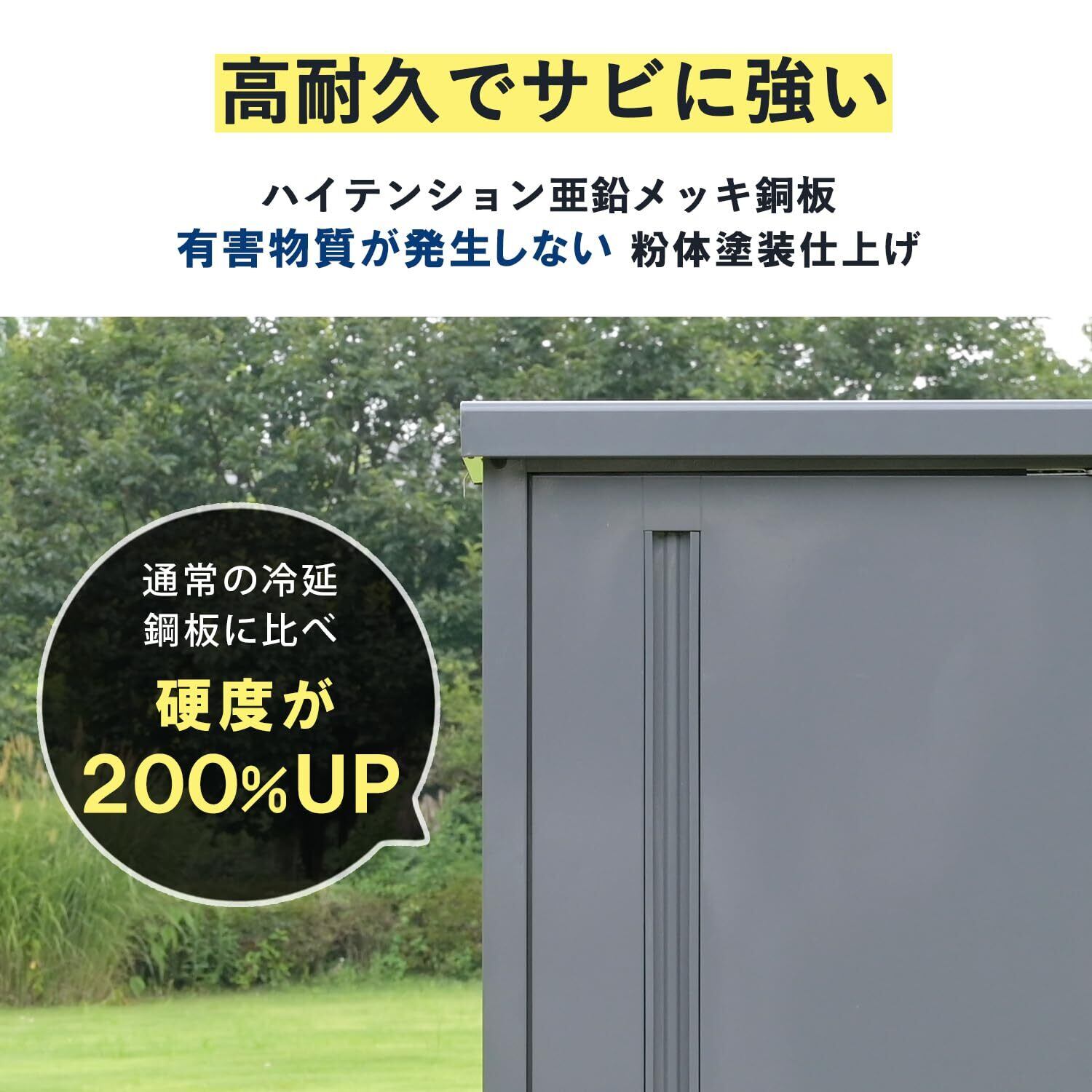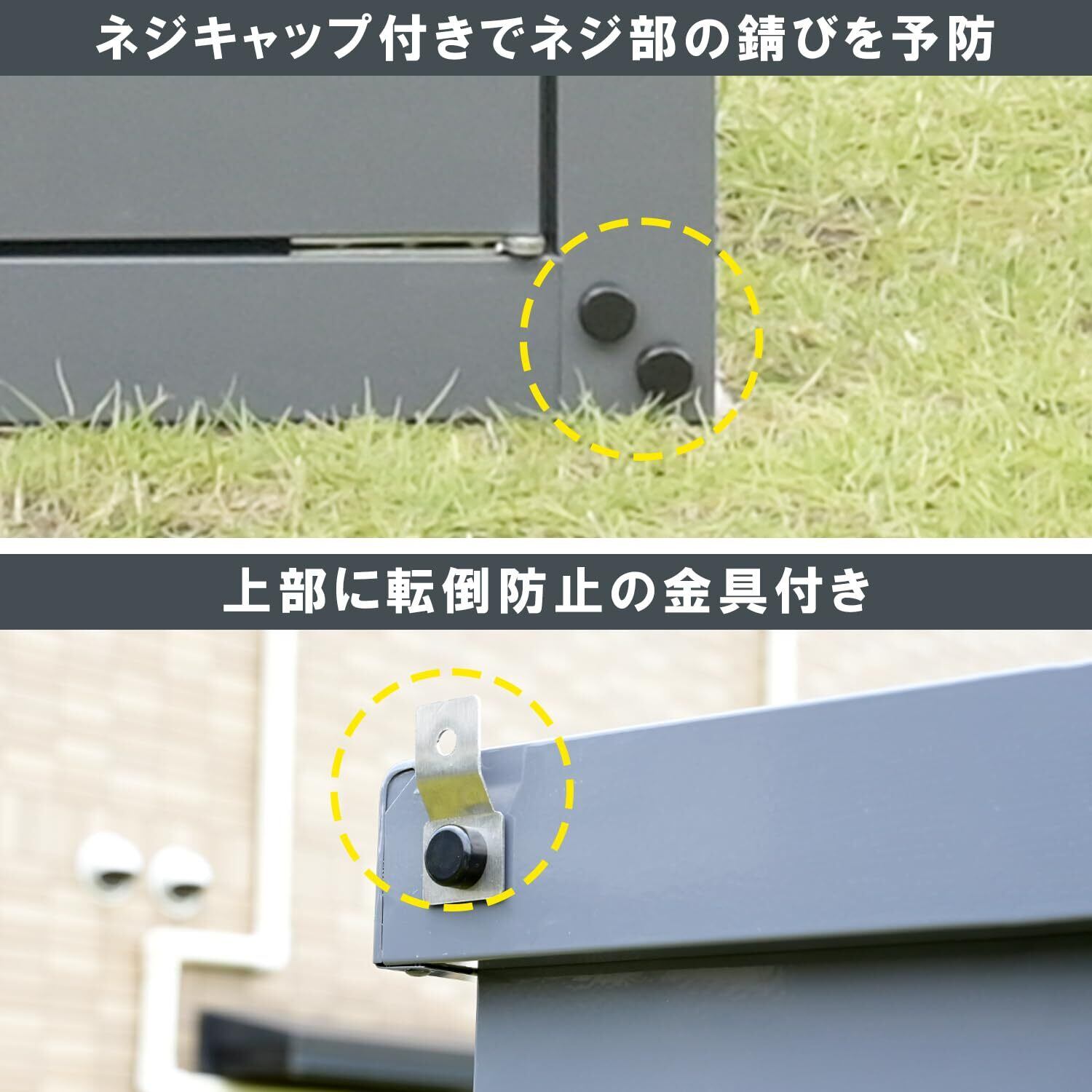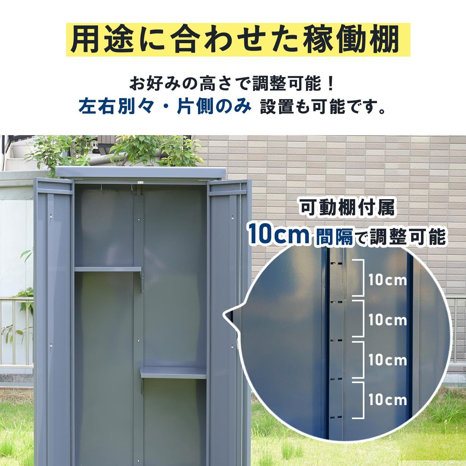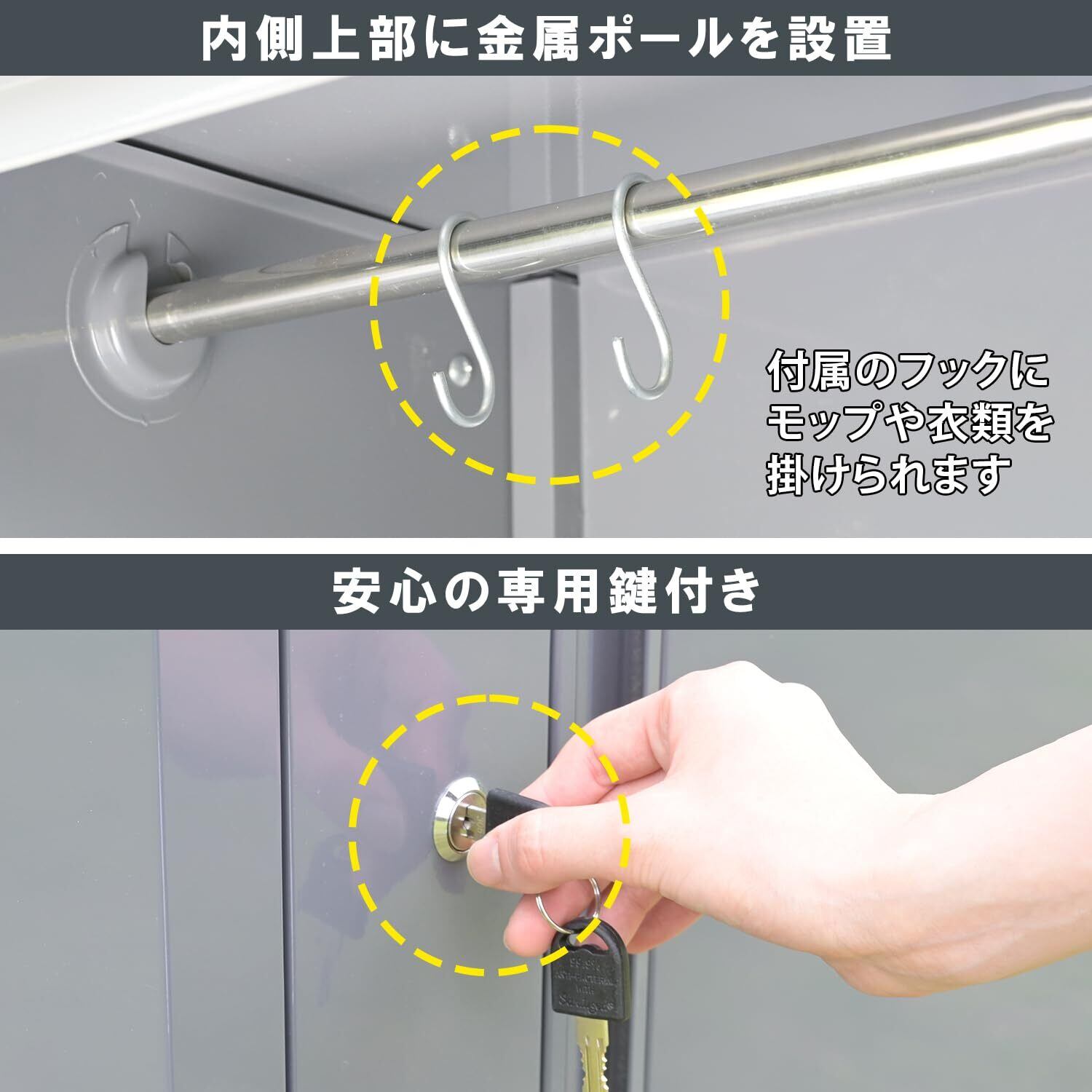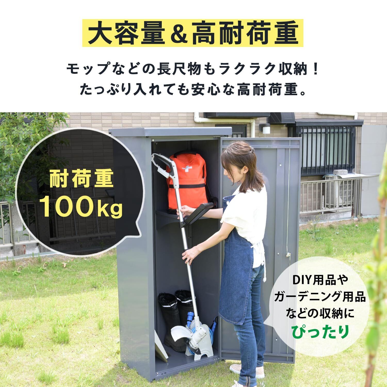 【特徴】多用途に使える高デザイン性の組み立て式物置(片開きタイプ)です。組立品です(組立時間:40-60分)。フロント扉に深めのスリットをデザインしました。材質に亜鉛メッキ鋼板を採用したことで、硬度がアップし衝撃やサビに強いです。長尺物でも出し入れし易い縦長の収納部が便利です。また内側の最上部に金属製ポールがあり、付属のフックにモップや衣類を掛けられます。※完全防水仕様ではないため、吹き込みなどによる雨水侵入のおそれがあります。