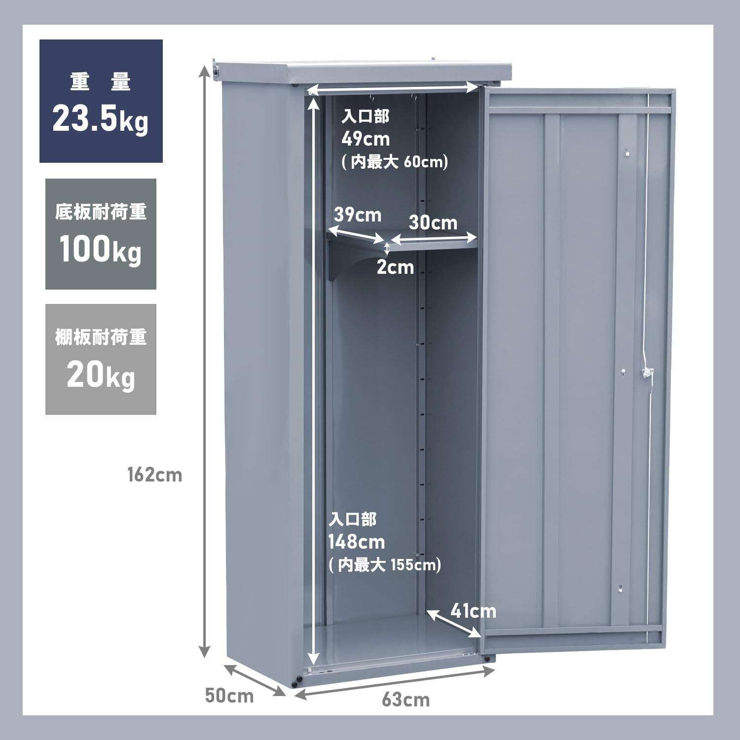 【商品仕様】本体サイズ:(外寸)=幅60×奥行45×高さ162cm、(収納部内寸)=幅60×奥行41×高さ155cm/重量:23.5kg/耐荷重:(底板)=約100kg、(棚板)=約20kg/材質:亜鉛メッキ鋼板(粉体塗装)/カラー:限定グレー/可動棚(幅30×奥行39×高さ2cm):1枚付き ※高さ約10cmピッチ/専用鍵付き