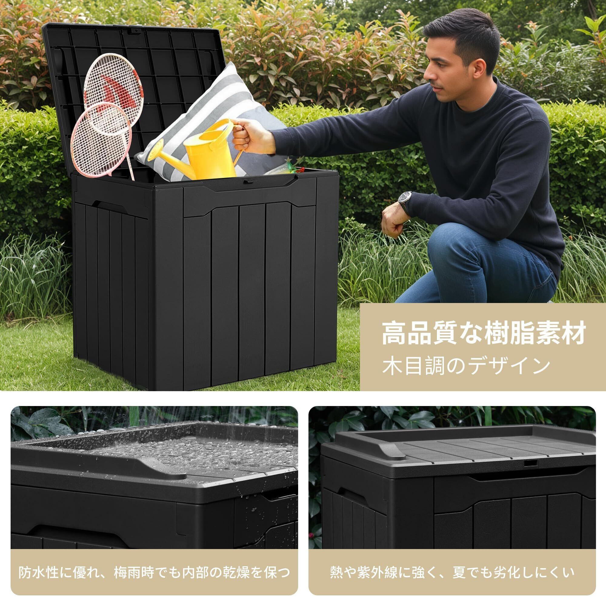「高品質なポリ樹脂素材」この収納庫は丈夫で耐久性のあるポリ樹脂を採用しており、耐日光耐紫外線が良い、曲がらない、耐久性と安定性に優れています。木目調のデザインが全体に使われており、シンプルで贅沢な雰囲気を醸す出しています。収納用途だでけなく、飾りとしても使え、庭、プール、デッキ、ガーデンなどに適しています。様々な場所で大活躍!
