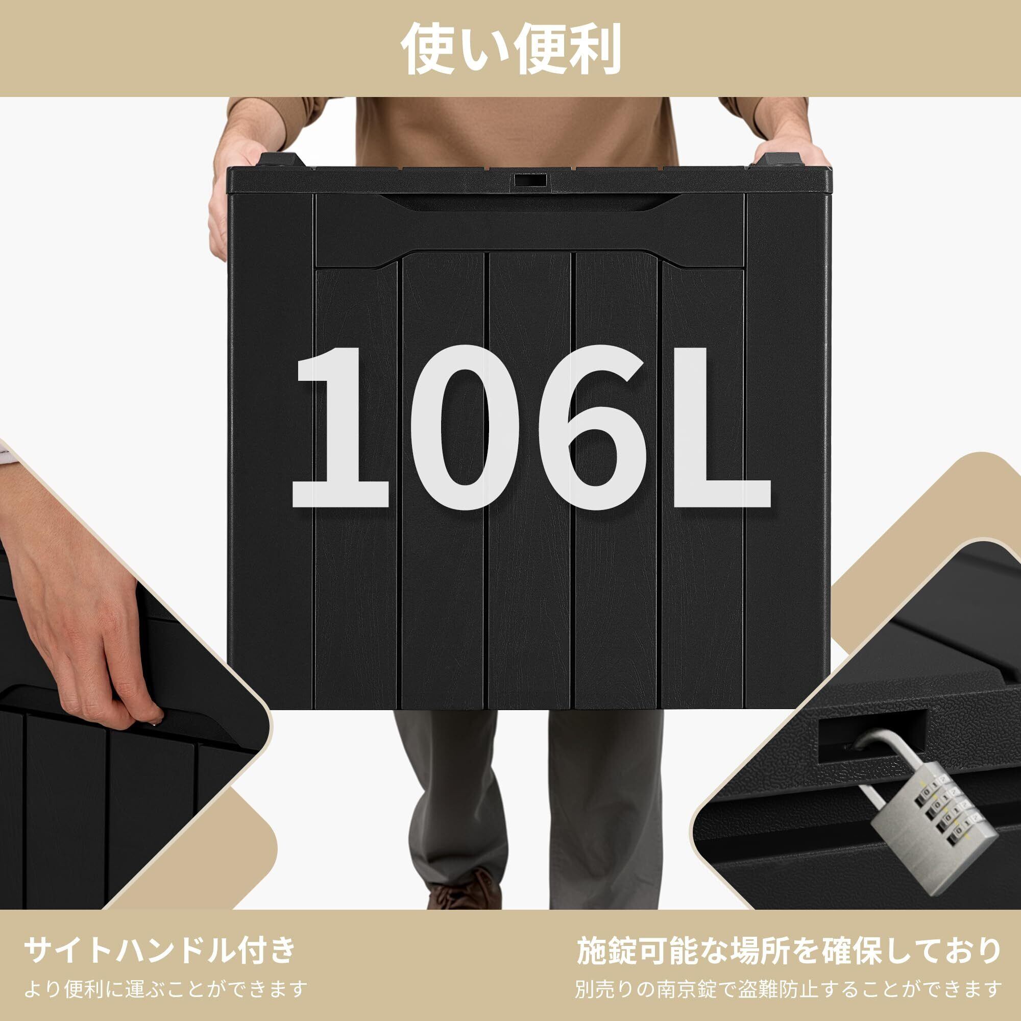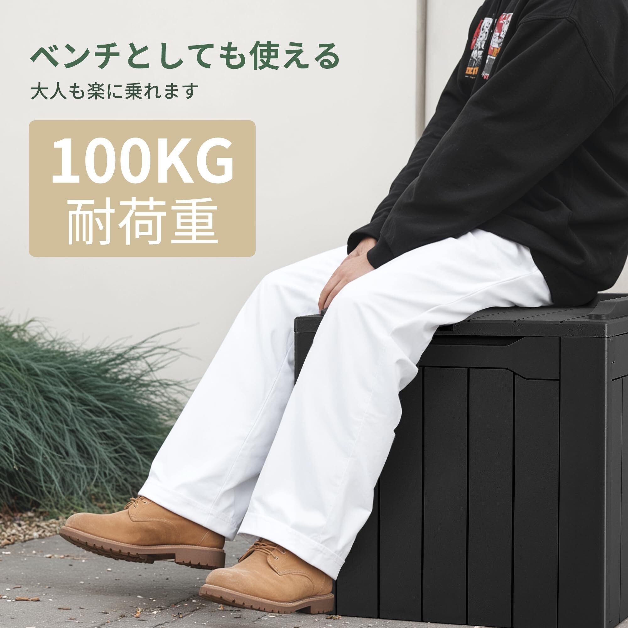 「便利なデザイン」サイドハンドルがあり、持ち運びがとても楽です。施錠可能な場所を確保しており、別売りの南京錠で盗難防止することができます。ベンチとしても収納用としても使用可能です。頑丈で耐久性に優れ、あんぜん耐荷重は100kgです。