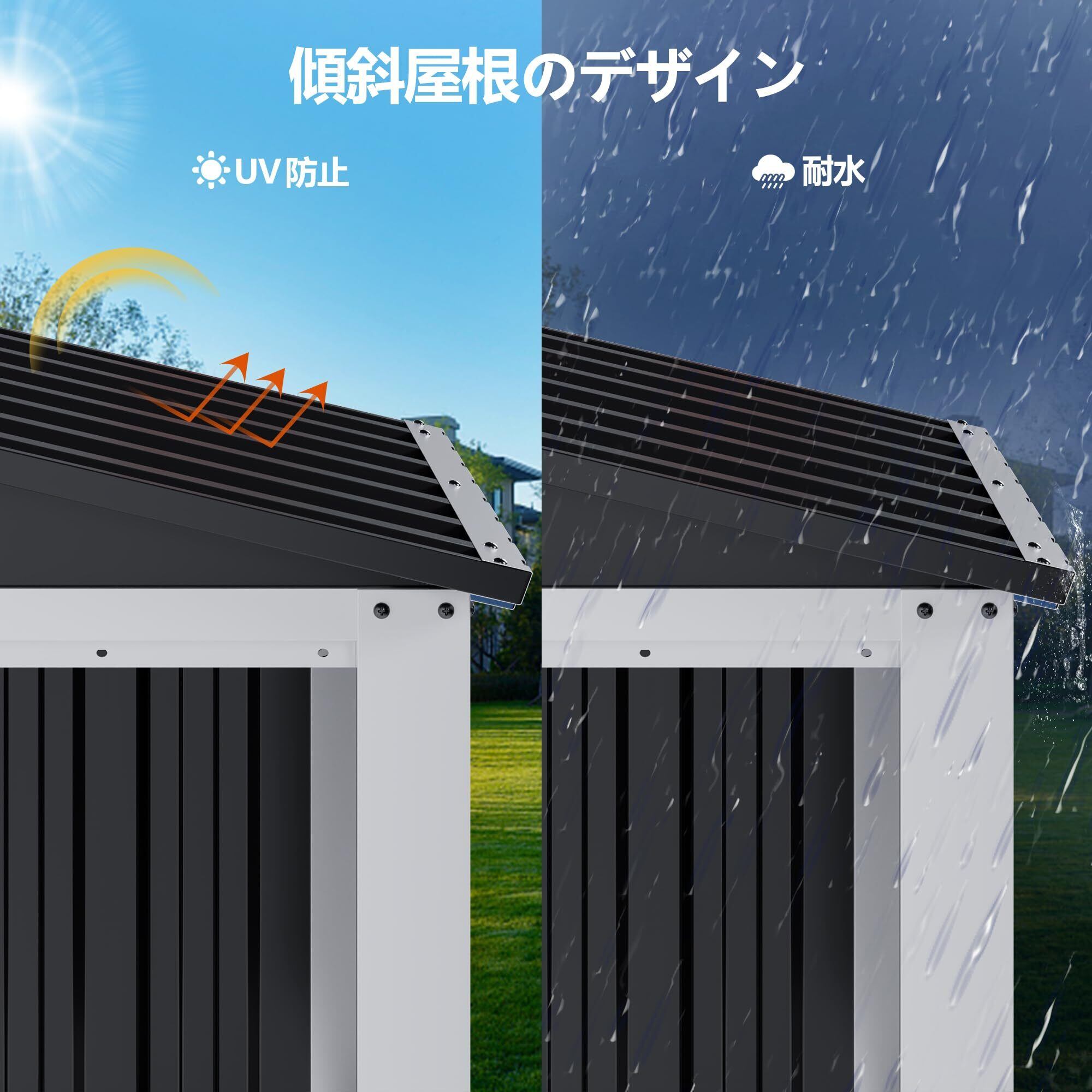 【ユニークなデザイン】金属小屋は傾斜屋根設計により、収納スペースが増えただけではなく、雨水が集まることによる錆つきを防いだり、雪や木の葉が屋根に積もるのを防いだりすることで、掃除やメンテナンスが容易になります。