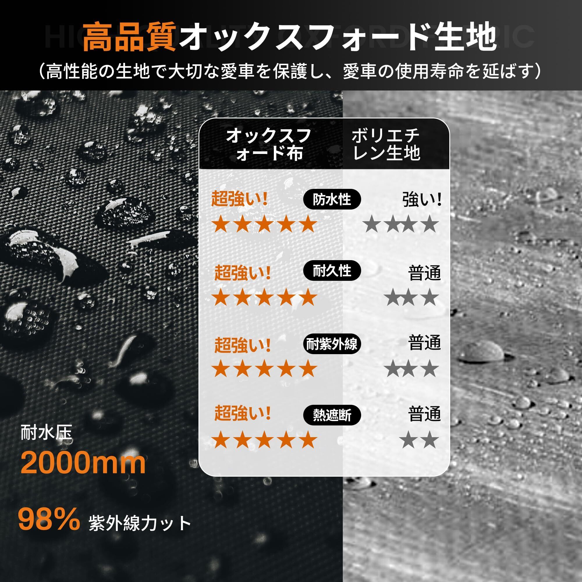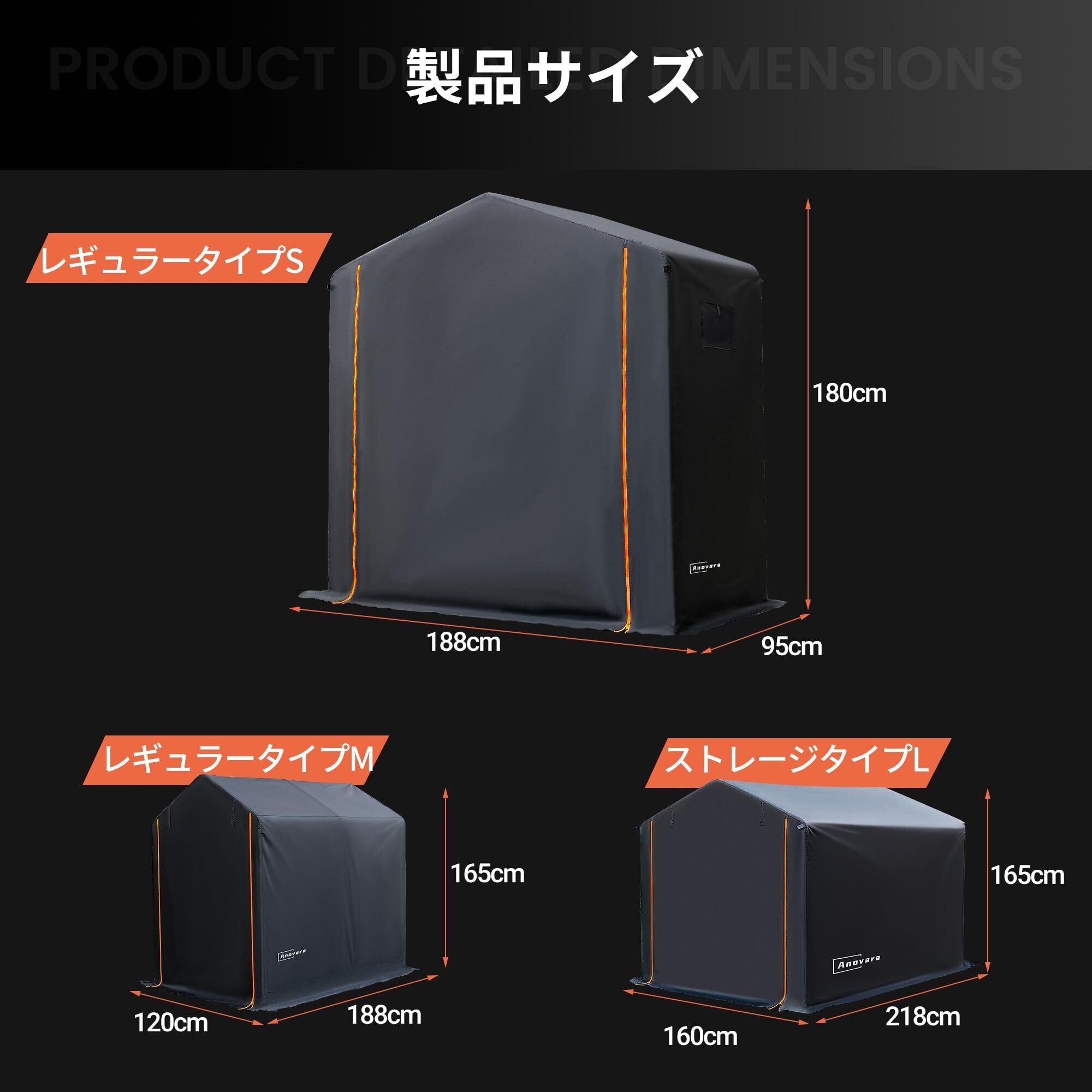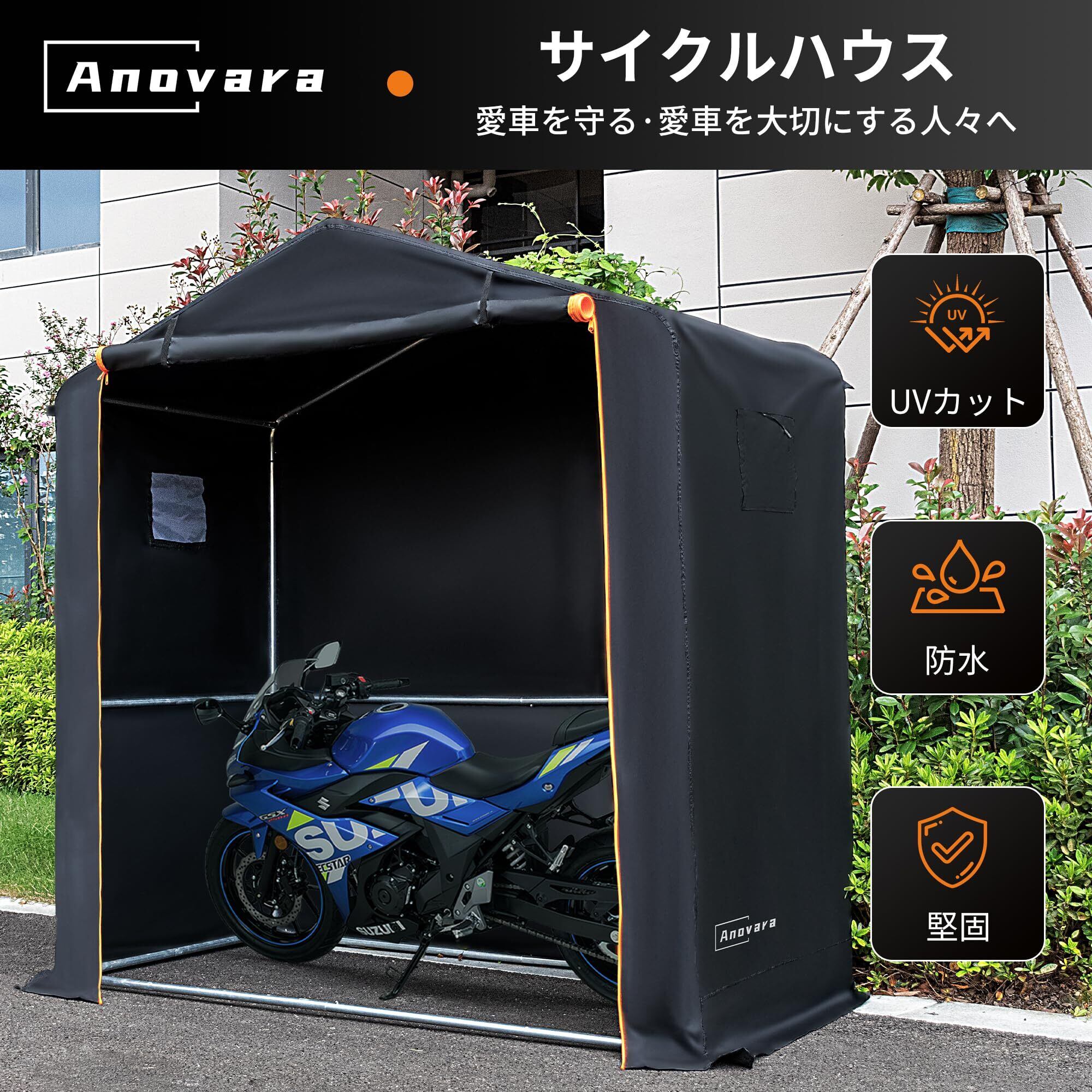[防水防塵日よけ]:カバーには高密度のオックスフォード生地を使用し、内部にはPUコーティングが施されており、耐水圧は最大2,000mm、優れたUV防止効果を備えています。カバーの縫い目にはすべてシーリング加工が施されており、日光や雨水の浸入を減少させます。カバーの底部に延長されたスカートは、雨水や小動物の侵入を防ぎます。Anovaraのサイクルハウス、愛車を風雨、日光、埃から保護し、使用寿命を延ばします。