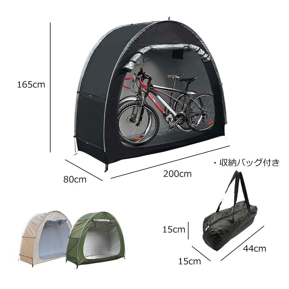 【仕様】自転車テント展開サイズ:200×80×165cm、折りたたみサイズ:44×15×15cm、大人用自転車2台収納可能。【重量】 2.5kg【カラー】 グリーン、ブラック、カーキ