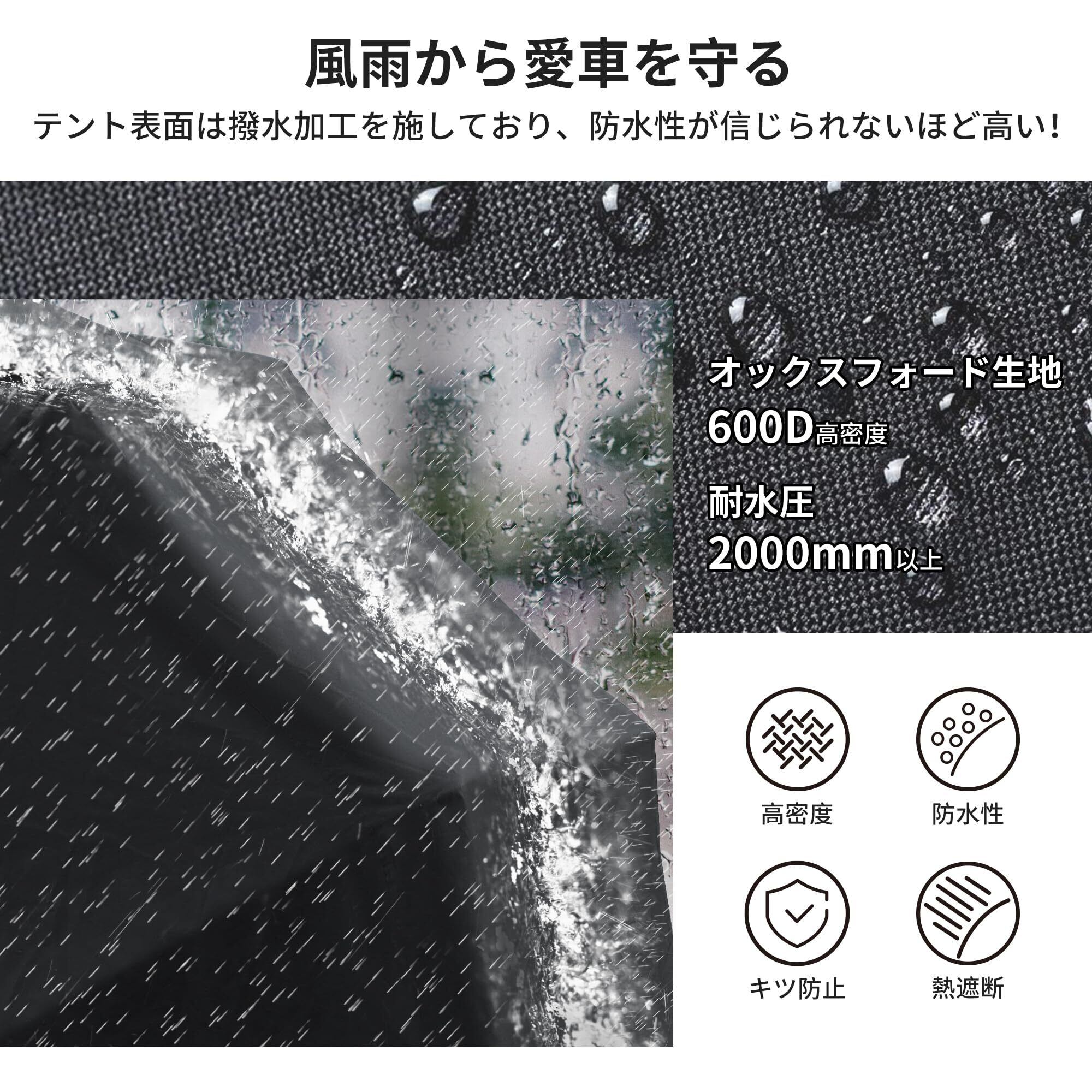 【日差しや風雨から愛車を守る】ガレージの布は600D高密度オックスフォード生地を採用!紫外線や熱を遮断し、大切な愛車の劣化や色あせを防ぎます。テント表面は撥水加工を施しており、防水性が信じられないほど高い!2000mm以上の耐水圧で雨水侵入を完全に防ぎます。