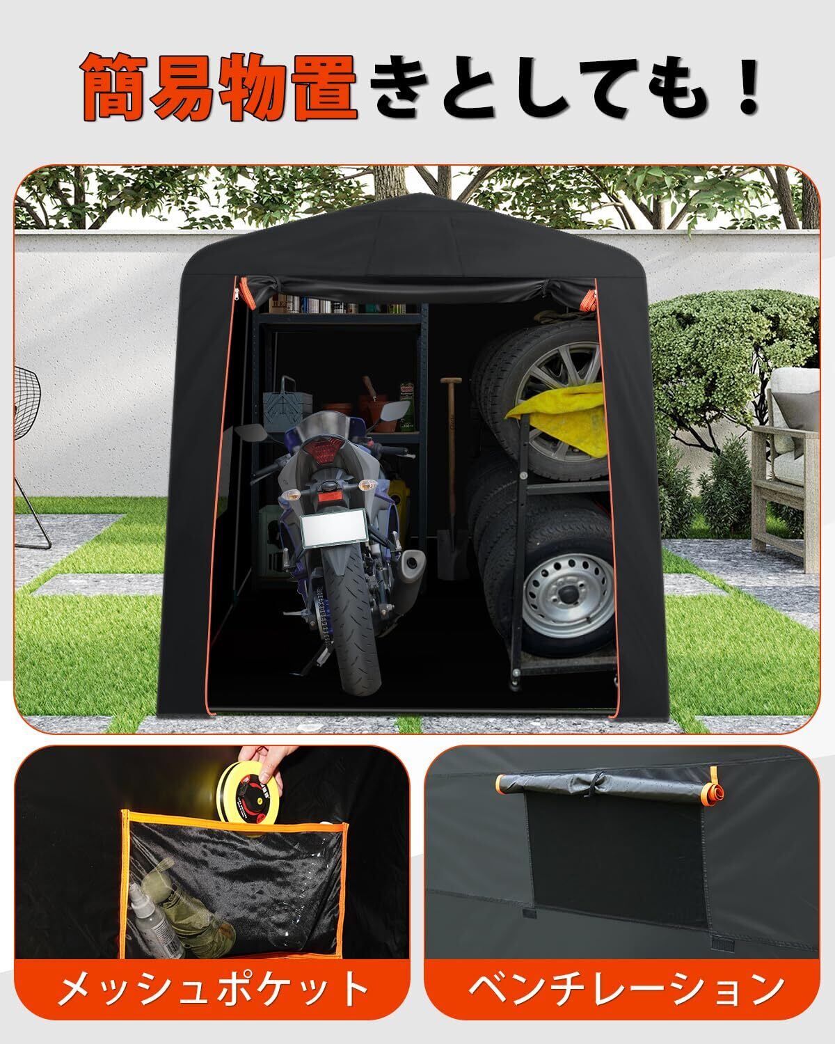 3.【簡単に組立】このバイクガレージの組み立て方法は。パイプのつなぎ目がジョイント式になって、工具いらない。初心者にも日本語説明書通りに簡単に組み立て出来ます。ガレージ内の換気も可能なメッシュ窓もあり、こもった熱気や湿気を通気させ、庫内での作業にも心配なく。