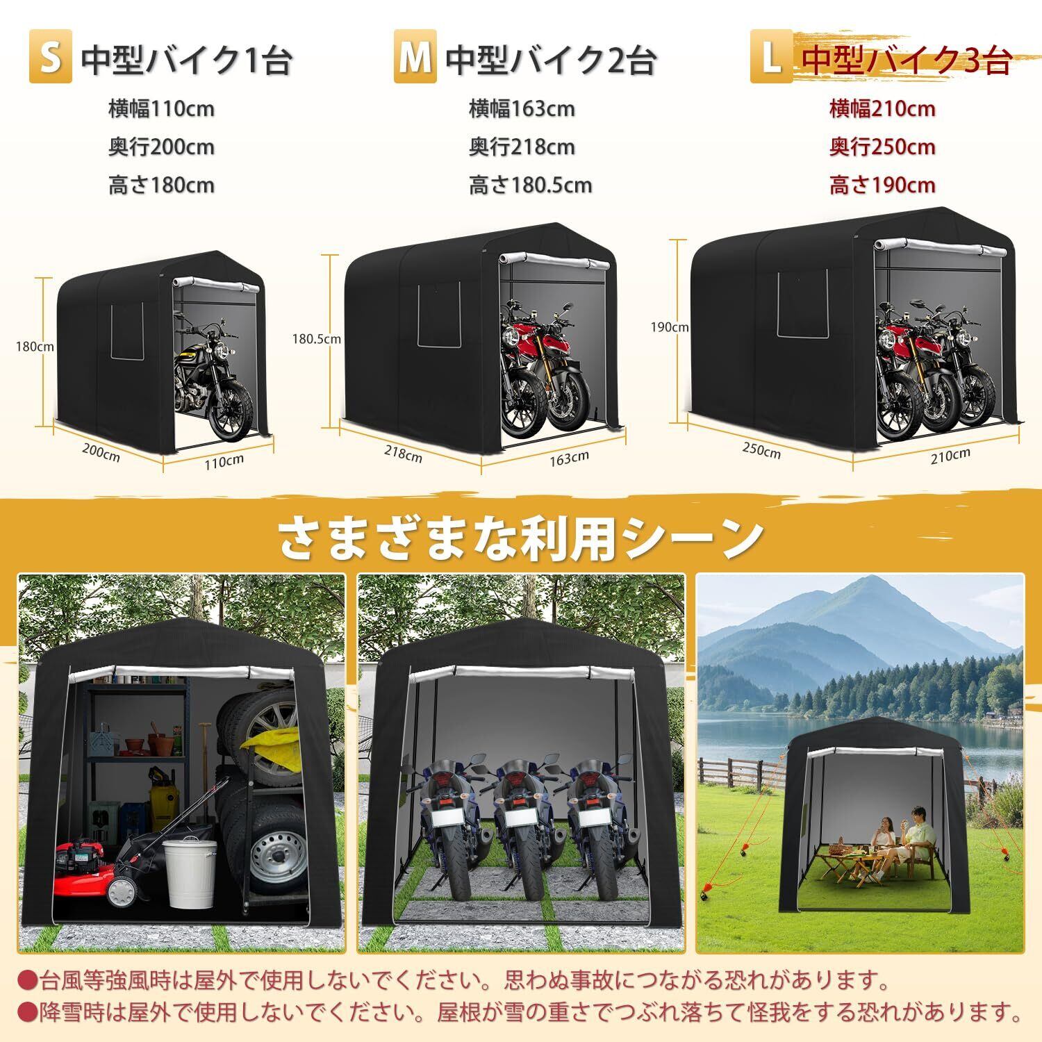 【商品仕様】商品Lサイズ:幅250奥行210高さ190cm、自転車最大4台収納可能。バイク最大3台収納可能。庭や軒先、畑や田んぼなど様々な場所でお使い頂けます。商品に4つの重石カバーと日本語取扱説明書があり、予めご了承ください。