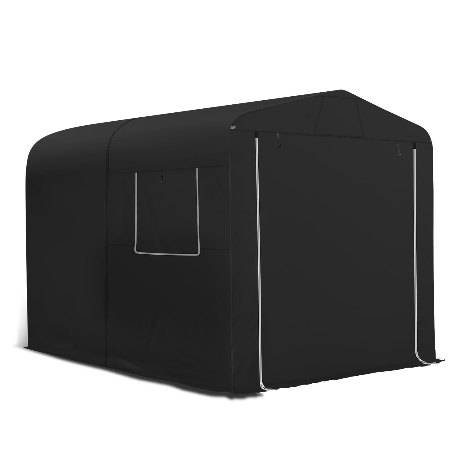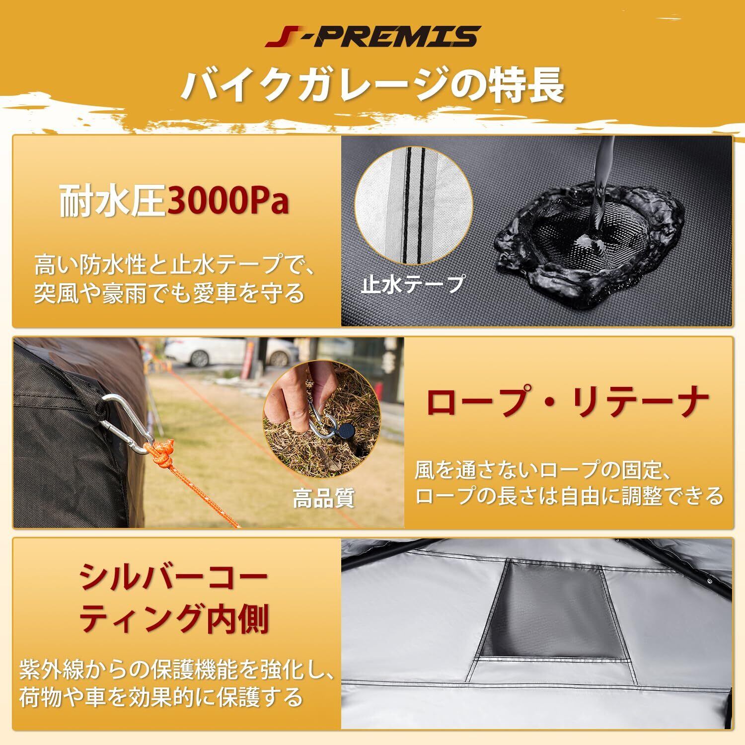 【2025最新型デザイン】バイクガレージの内部には新しく改良されたシルバーコーティングが施され、バイクガレージがより美しく仕上がるだけでなく、UVカット効果も効果的に向上します。 ジップヘッドは最新型のセルフロッキングジップヘッドにアップグレードされ、物置のジップを締めても風でジップが開くことがなく、物置内のアイテムの安全を守ります。