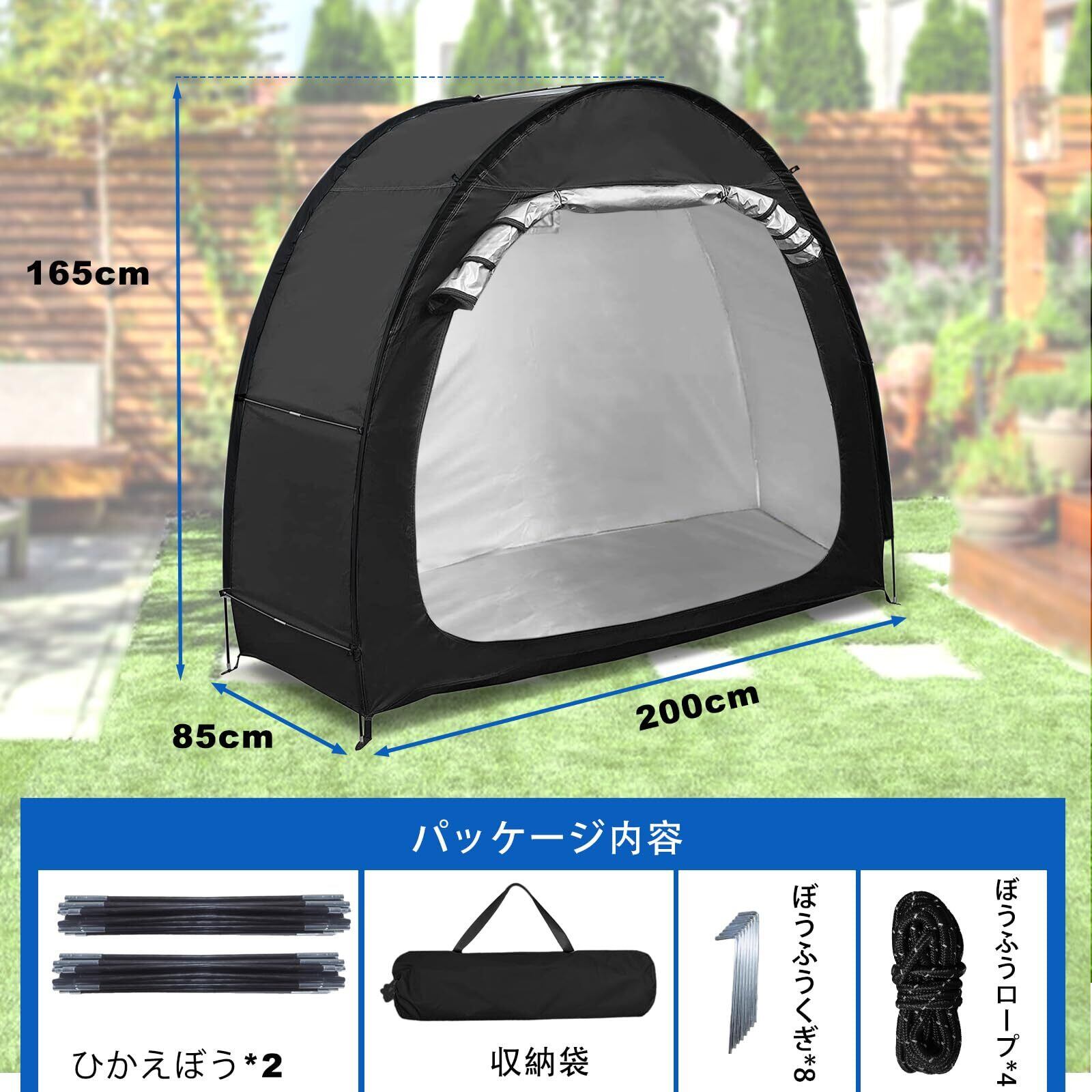 【幅広い用途、持ち運びやすい】200×80×165 cmの自転車置き場屋外は裏庭に1-2台の自転車を収納し、ガレージスペースや子供が遊べる場所を解放することができます。自転車置き場内部には自転車用帽子のフックがデザインされており、自転車用ヘルメットの収納に便利で、外付け側面通気口がデザインされており、また自転車用駐車場自転車車庫としてだけでなく、園芸工具、家具マット、芝刈り機、エアコン、プール玩具の収納庫としても使用できる。
