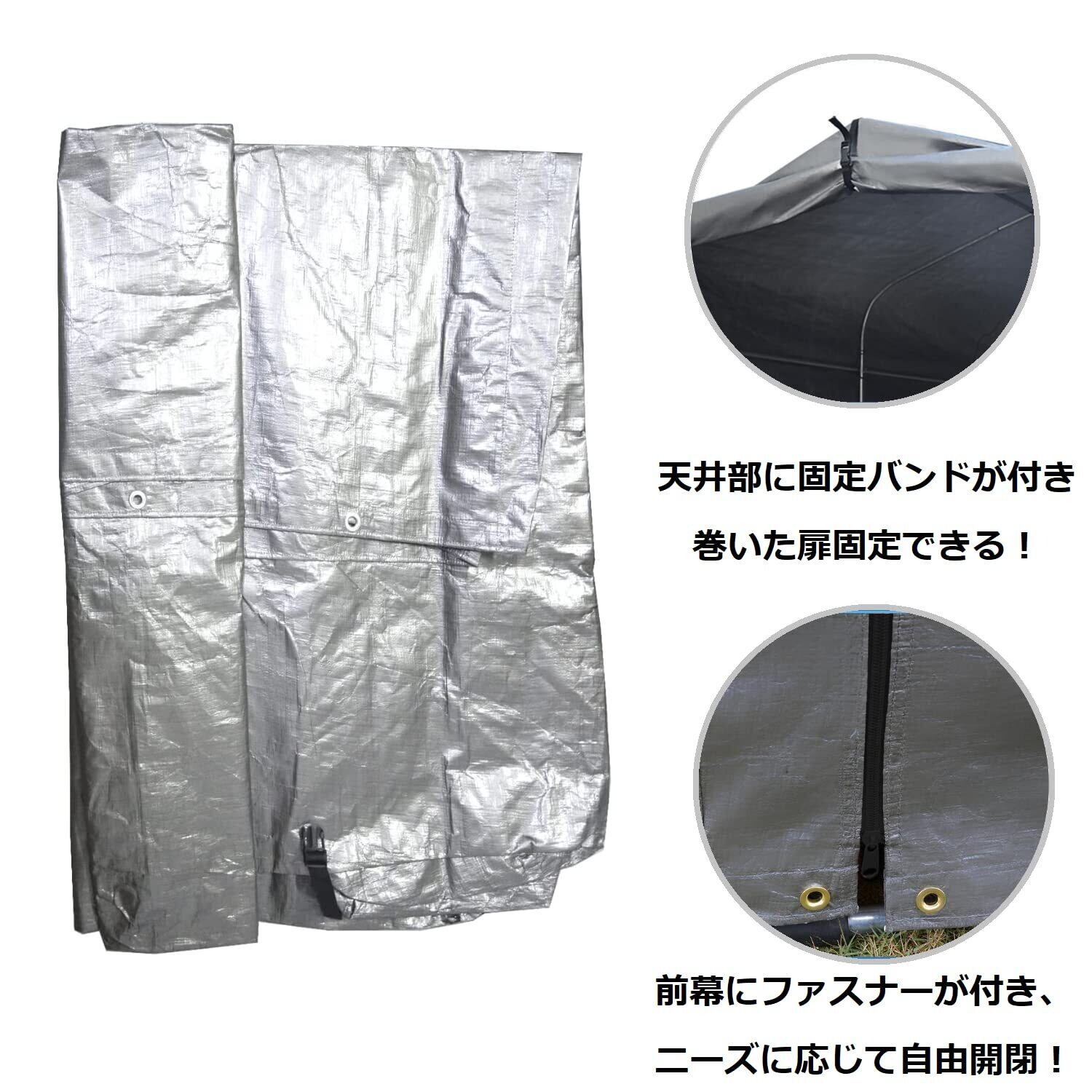 【使用簡単】取替用カバーの前幕にファスナーが付きます。また、天井部に固定バンドがあって、巻いた前幕を固定できます。また、セットには固定バンドが付き、サイクルハウスカバーを骨組みに固定できます。折り畳み式で、使用しない場合はタンスに収納できます。