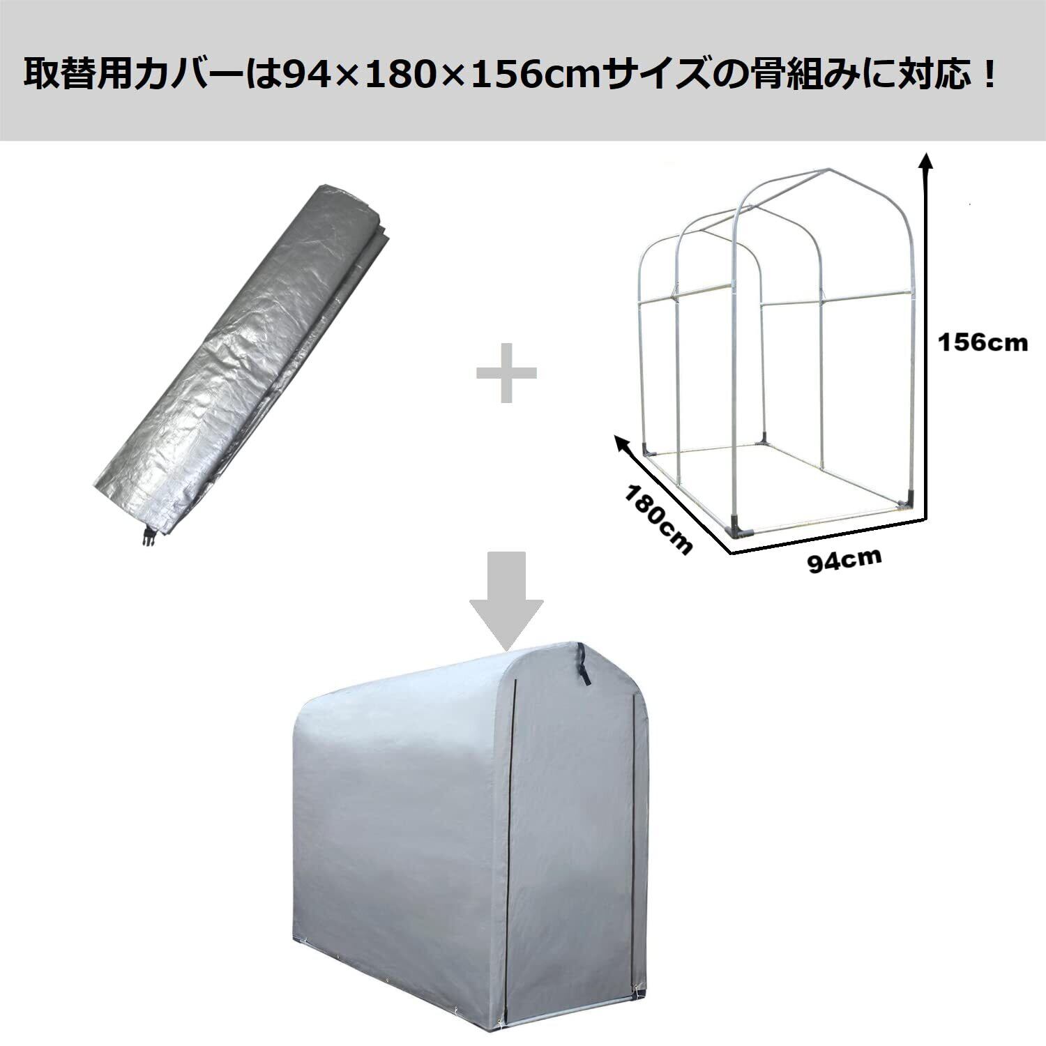 【対応骨組】取替用カバーはサイズ94(幅)×180(奥行)×156(高さ)cmの2台用サイクルハウスの骨組みに対応できます。