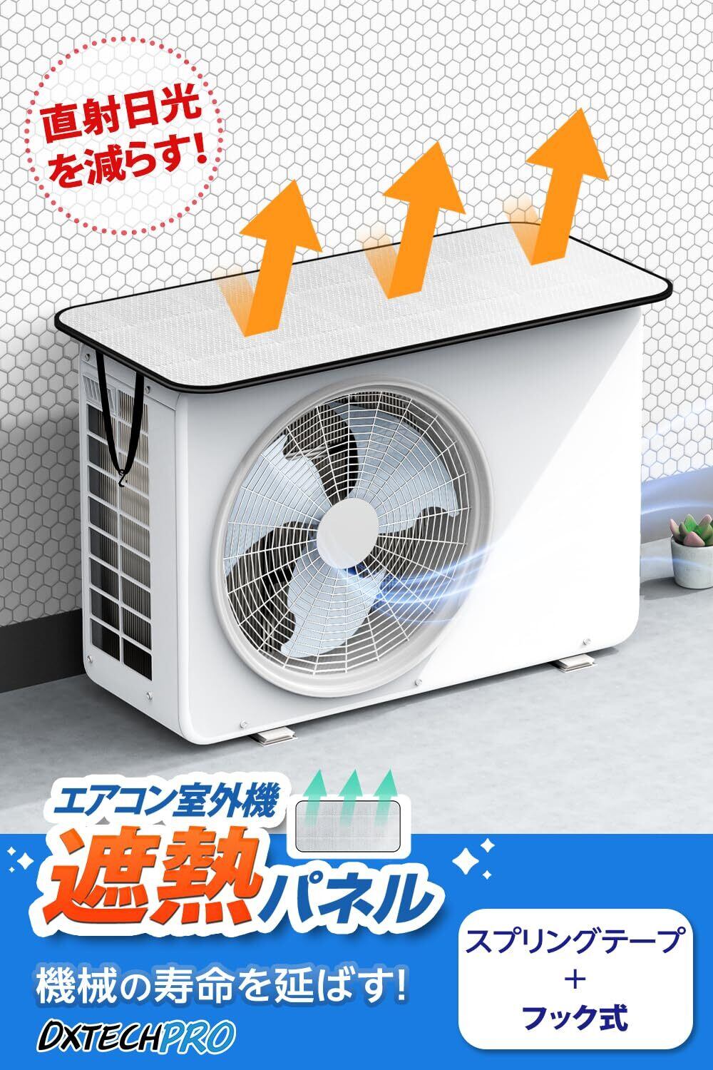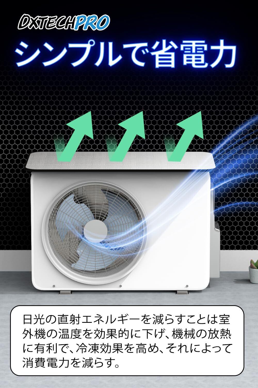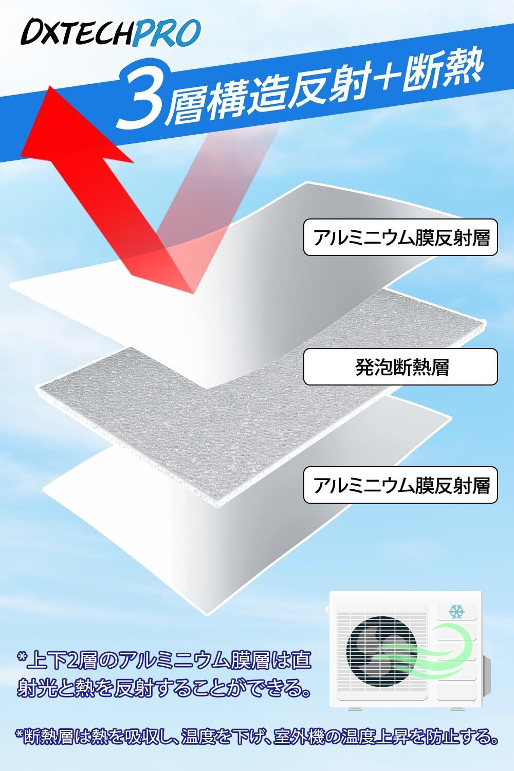節電・省エネ、効率アップ:改良版エアコン室外機遮熱カバーは、光反射素材を採用、遮熱3層構造、約40%の熱線をカットし、室外機の熱を下げて、エアコン冷却効果が上がることで、節電省エネ対策!