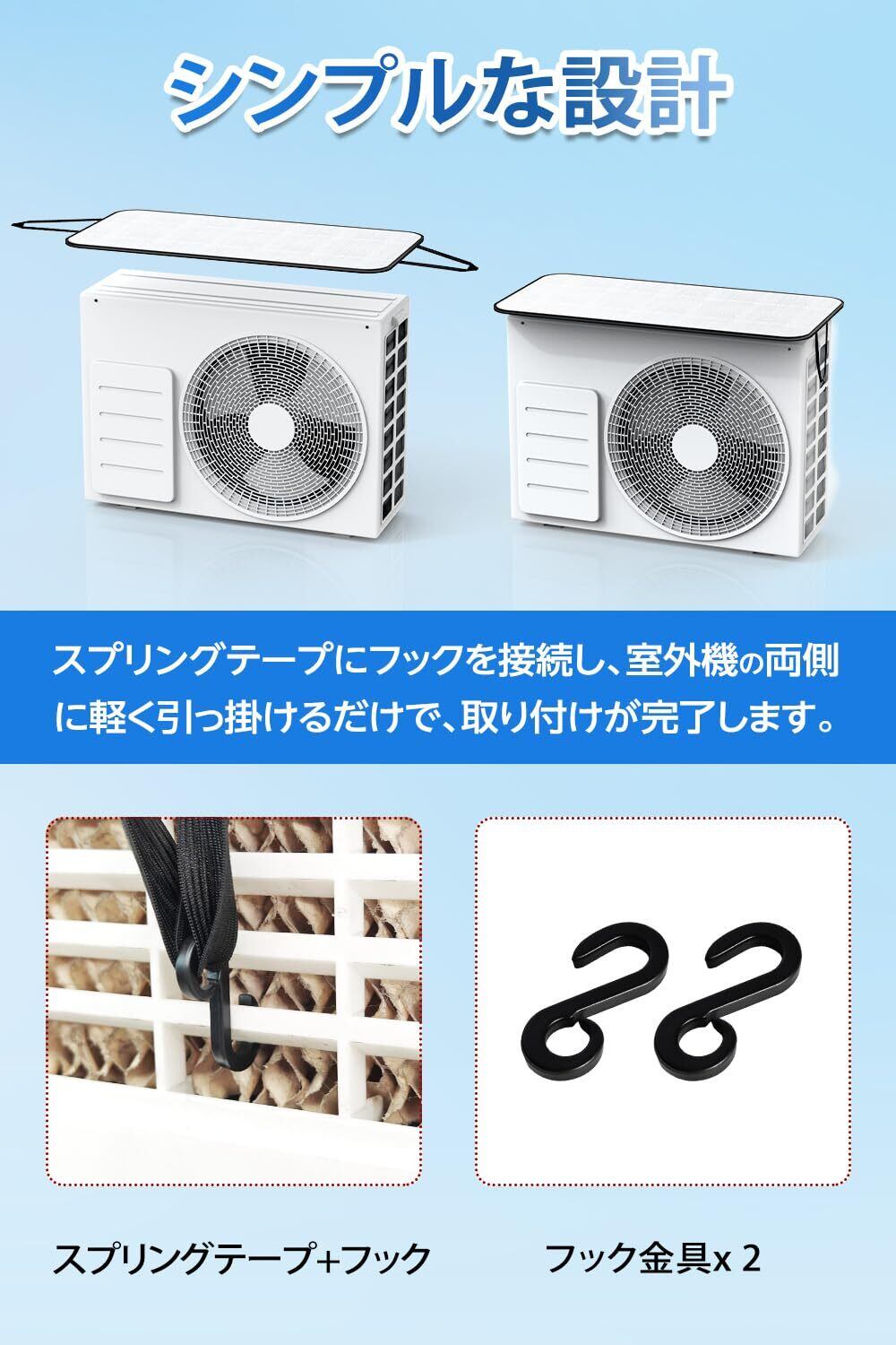高弾力固定ストラップ、取付け簡単:弾力性のある固定ストラップをを採用し、各種サイズの室外機に対応できます。取り付けが簡単なフックが付属、エアコン室外機をしっかり守る事ができます。室外機カバー使用しない時は折りたたんで収納できます。