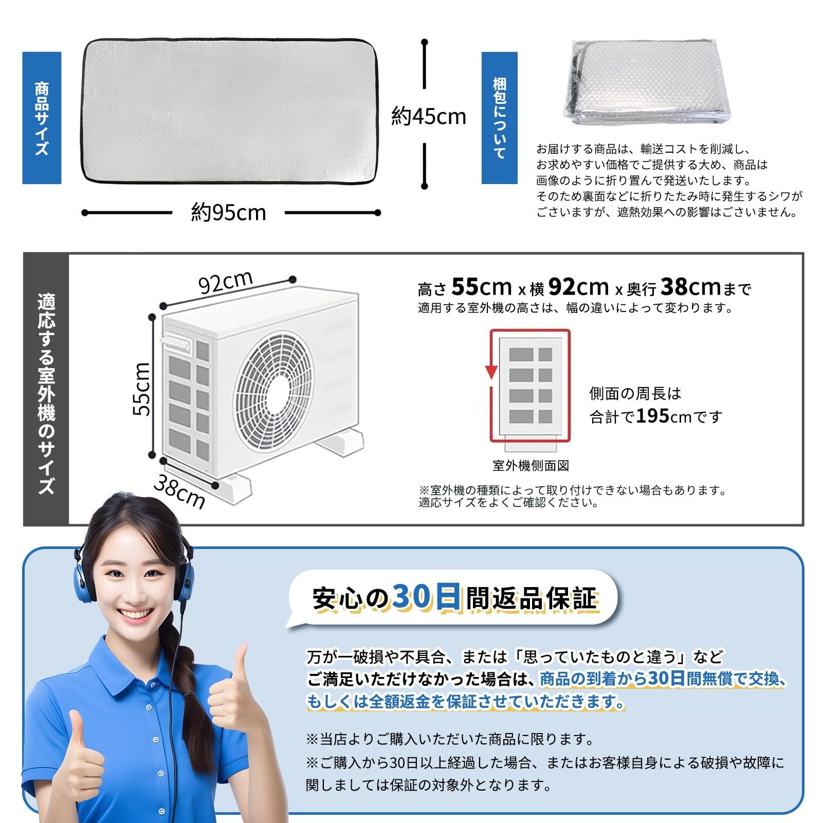 【お知らせ】同梱の取扱説明書に記載の「対応可能な室外機サイズ」は、現在の仕様と一部異なる場合がございます。最新の正しい対応サイズは、本ページの商品情報および画像のサイズをご参照ください。侧面の周長は合计で195cmです