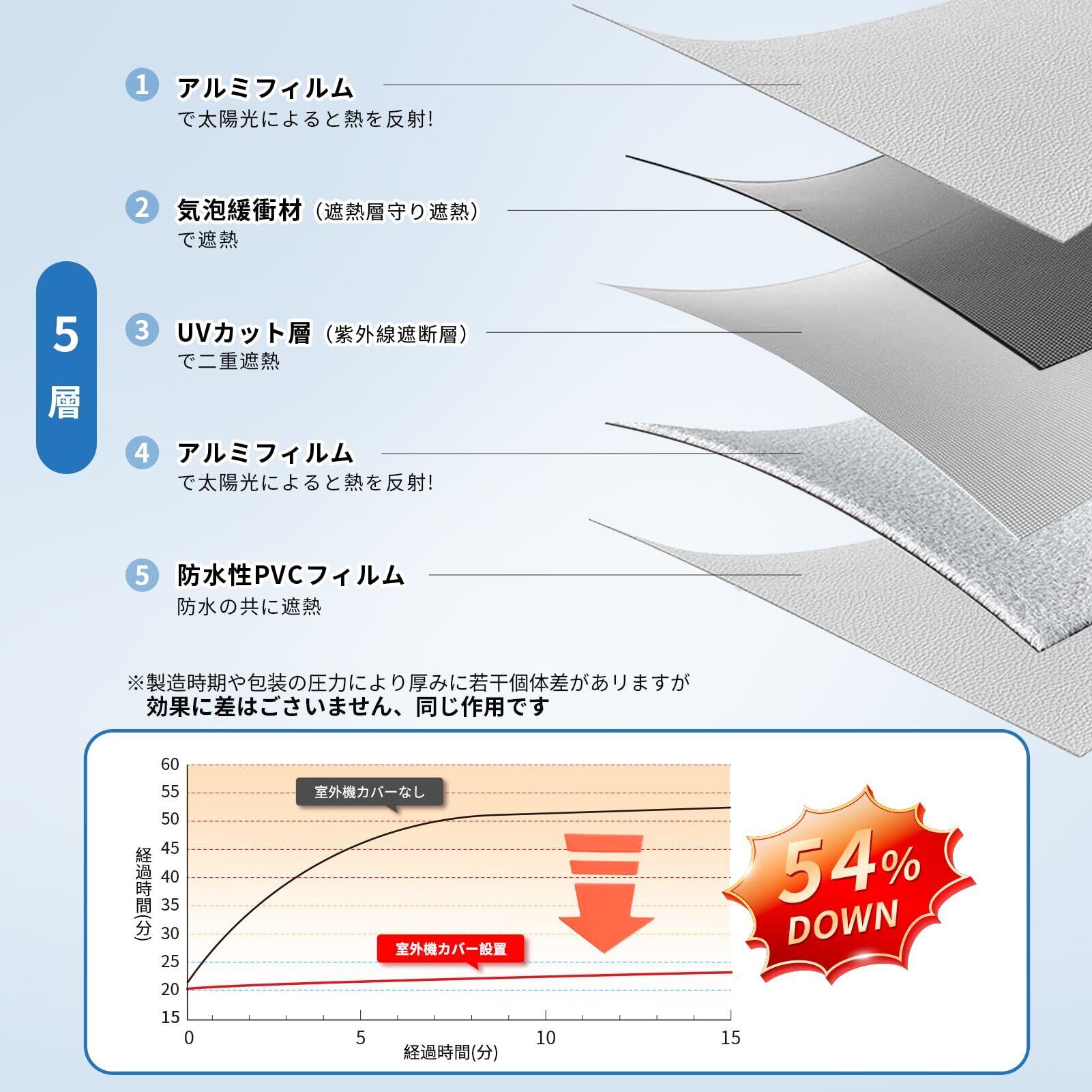 【悪天候対策】撥水加工が施されたエアコン室外機遮熱シートは、直射日光、雨、雪などの過酷な天候から室外機をしっかり守ります。雨の日でも、室外機が快適に機能し、長期間の使用をサポートします。