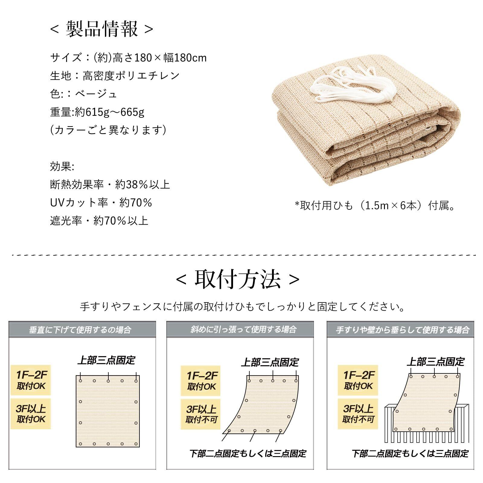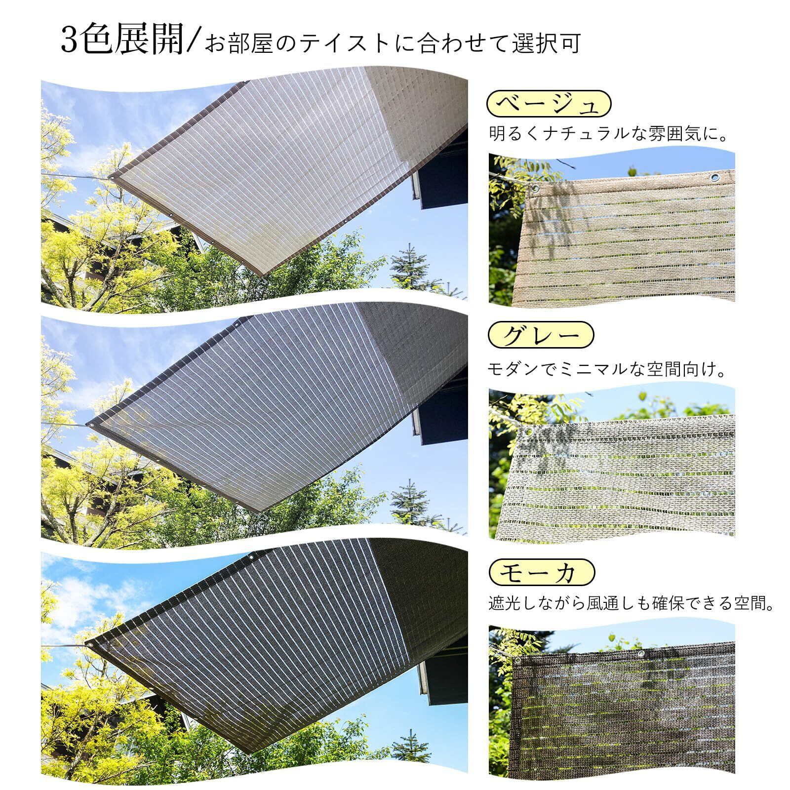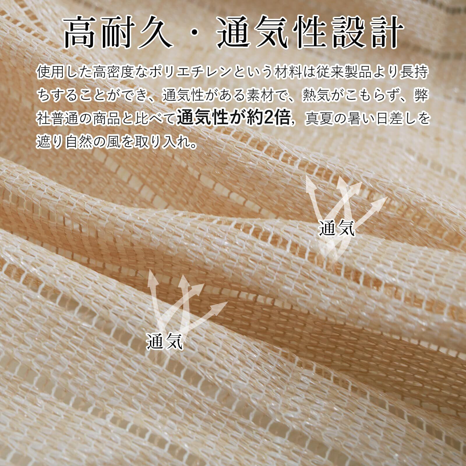 高通気性がある素材で、熱気がこもらず、遮光率80%で日差しと紫外線をカットすることで省エネ効果も期待できます。普通の商品と比べて通気性が約2倍,内部から外への見通しは良く、圧迫感はありません!外から見えにくくなり、日差しと視線を遮って、涼しく快適にお過ごしいただけます。