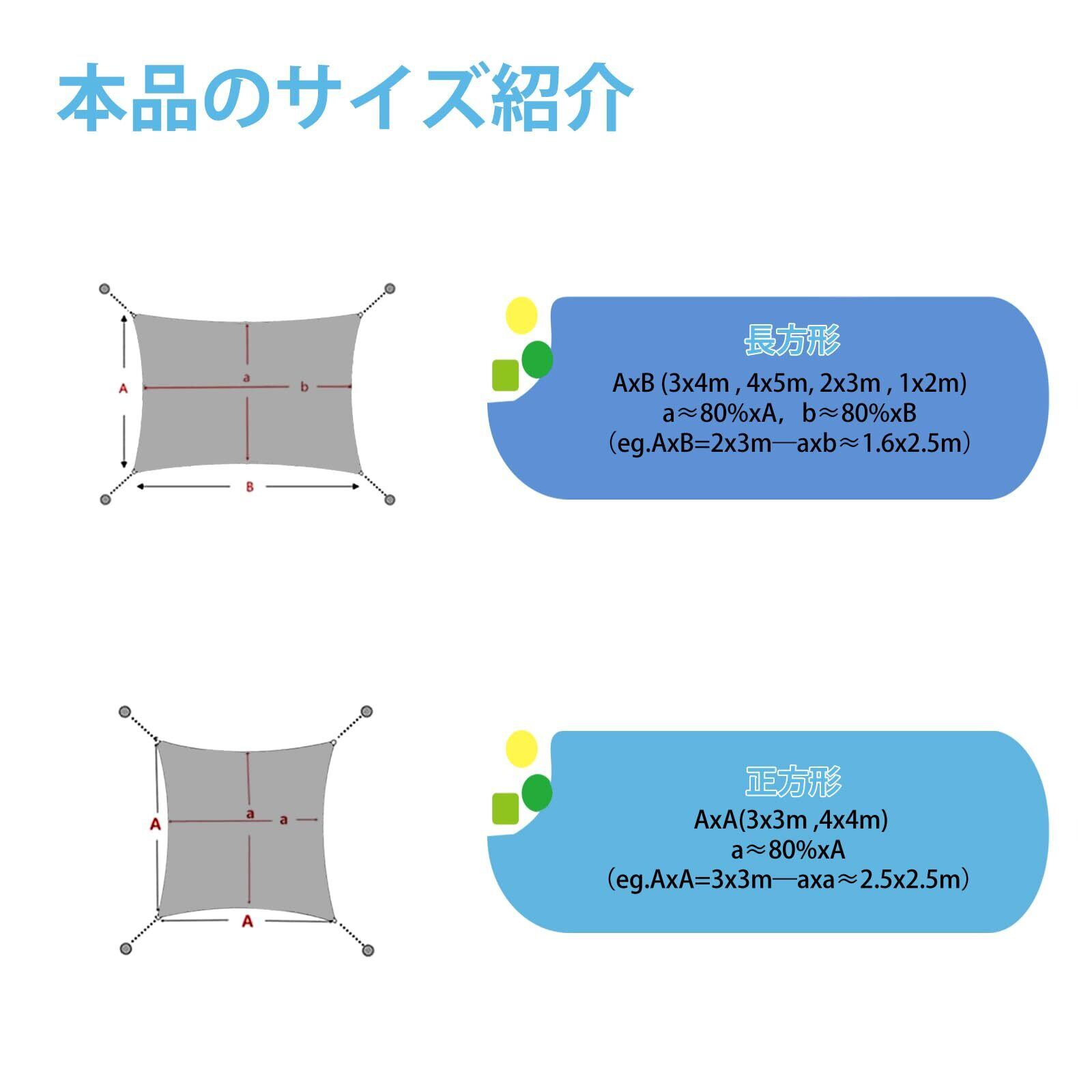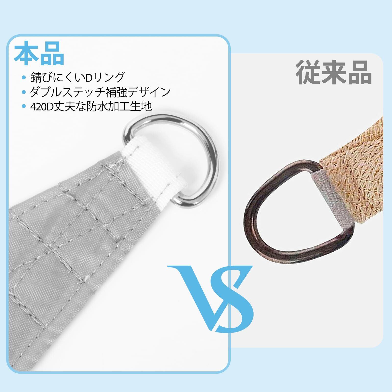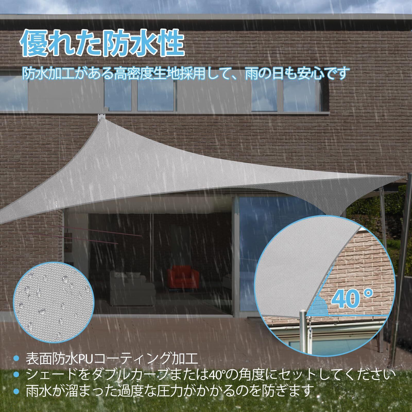 【優れた防水機能サンシェード】ほかのメーカーよりよい高品質の高密度420Dオクスフォードを採用して、裏面に2層撥水PU塗装して、撥水効果に優れたのシェードです。急に雨が降ってきた場合でも、雨よけになり濡れずに安心です。4つの辺りはカーブエッジデザイン採用して、高い張力に耐えて、垂れ落ちを防ぎます。雨のたまりことがないため、設置角度は40°お勧めしています。