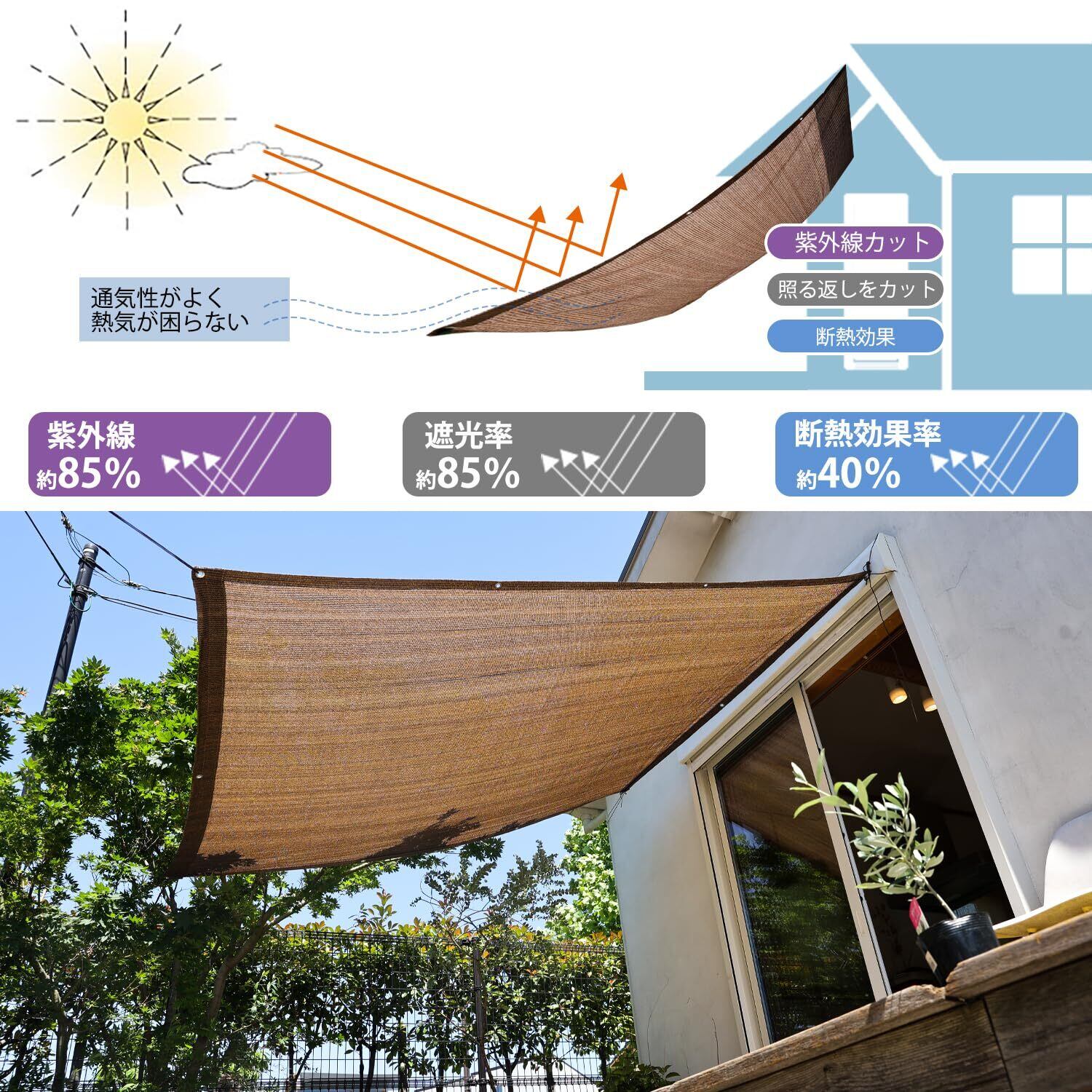 「遮熱・風通し両立」耐熱性に優れた素材で作られ高温環境でも劣化が少なく、耐久性があります。風合い効果も発揮しながら目隠し効果もあります。快適で健康的な室内環境を実現するのに役立ちます。